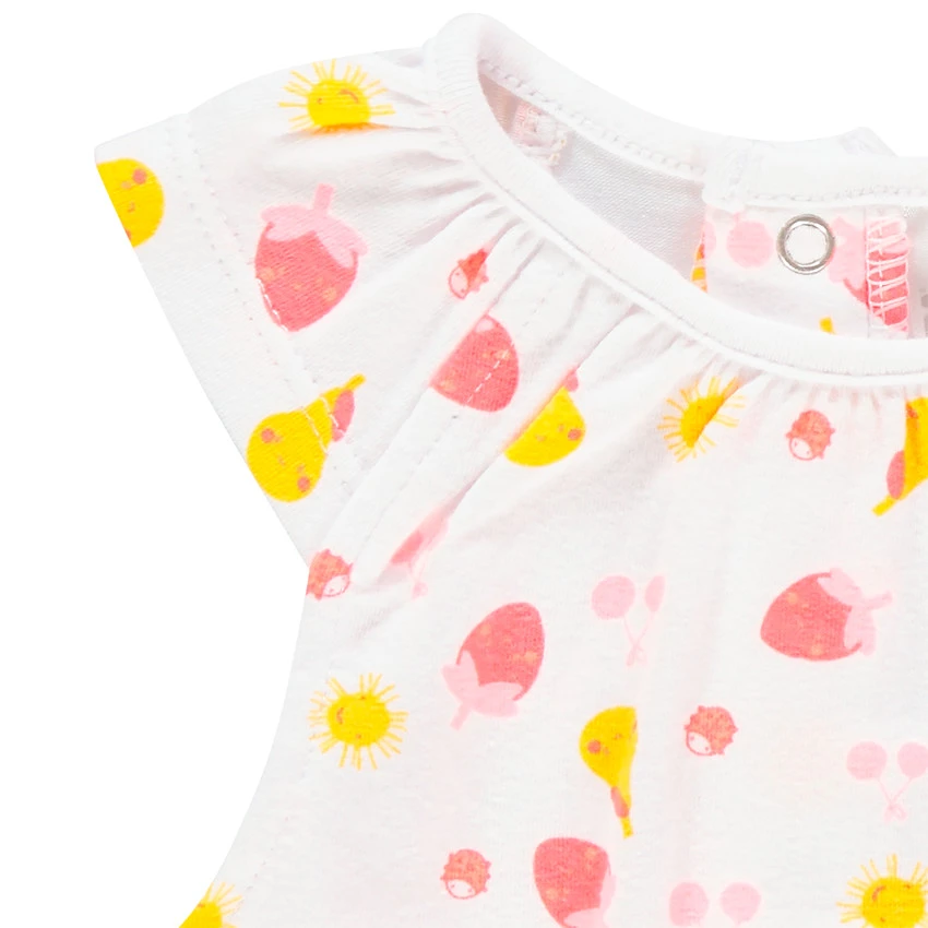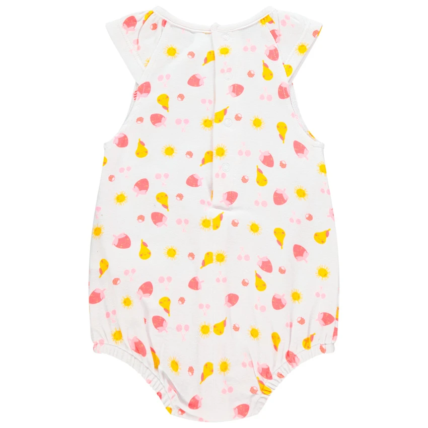 Combinaison courte à fruits imprimés all-over. Encolure ronde. Entrejambe pressionné. Dos pressionné.