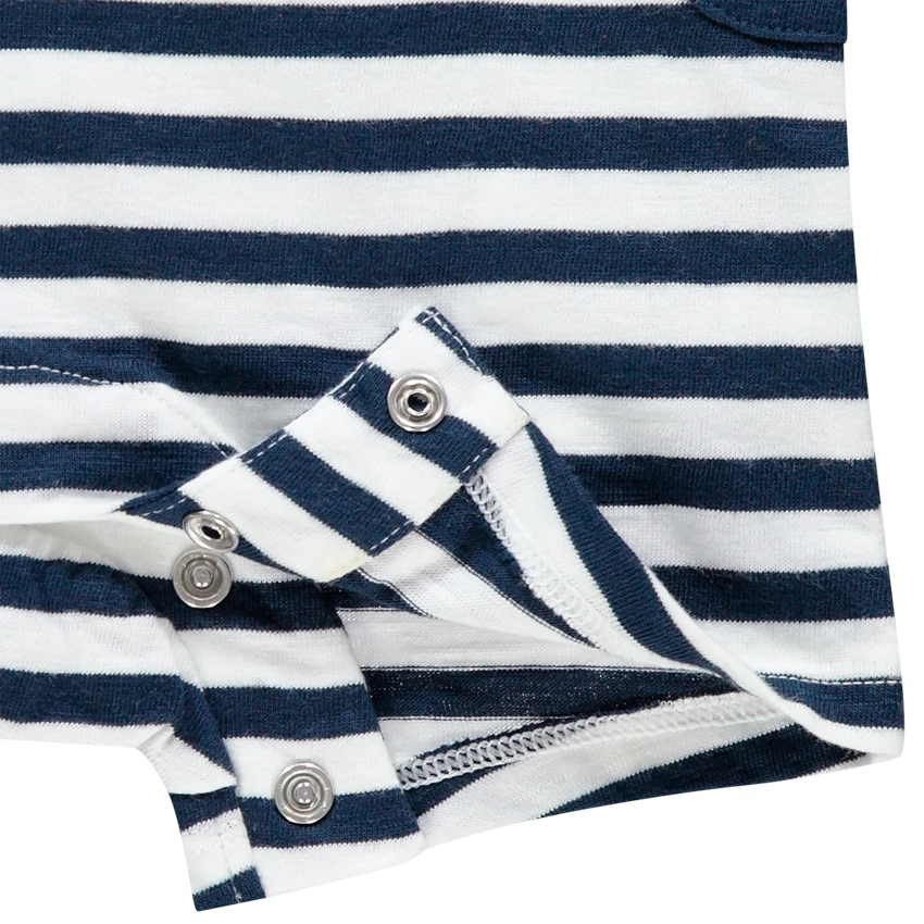 Cominaison courte à rayures all-over. Encolure ronde. Ouverture boutonnée devant. Michey en bouclette sur la poitrine. 2 poches plaquées sur les jambes. Entrejambe pressionné.