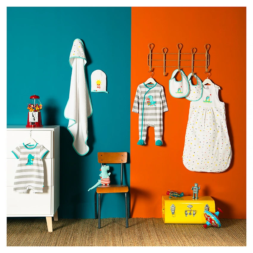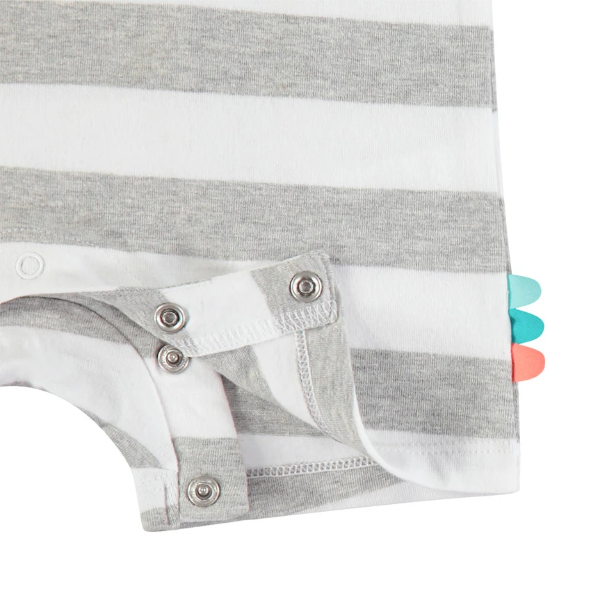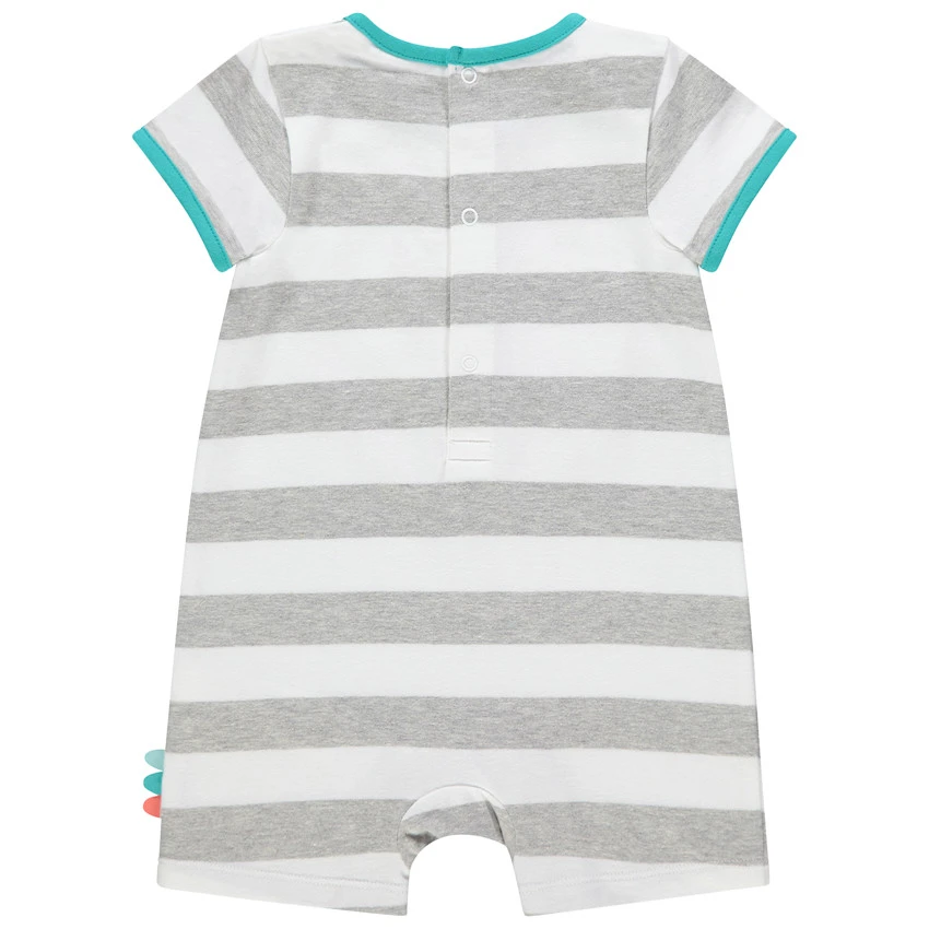 Combinaison à bandes contrastées. Encolure ronde en bord-côte. Dinosaure patché devant. Petite crête colorée en relief sur le côté. Entrejambe et dos pressionnés.
