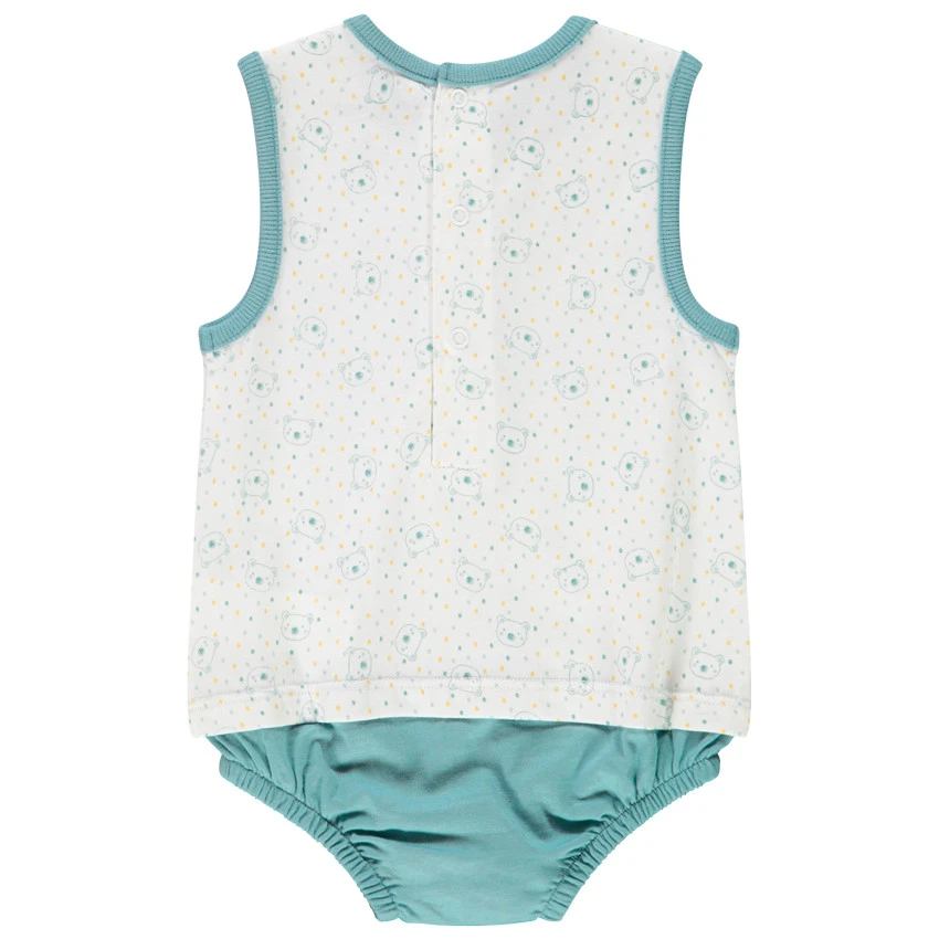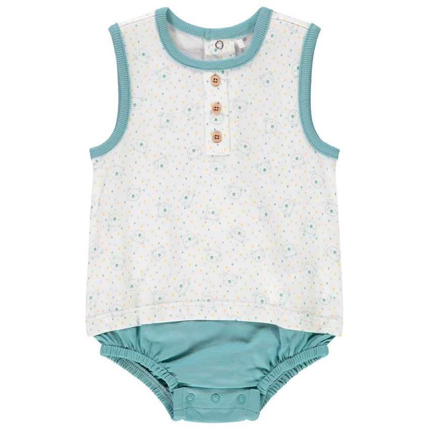 Combinaison courte. Encolure ronde et emmanchures en bord côte contrasté. Boutons sur le devant. Imprimé ours all-over. Bloomer contrasté. Cuisses élastiquées. Ouverture pressionnée dans le dos et à l’entrejambe.