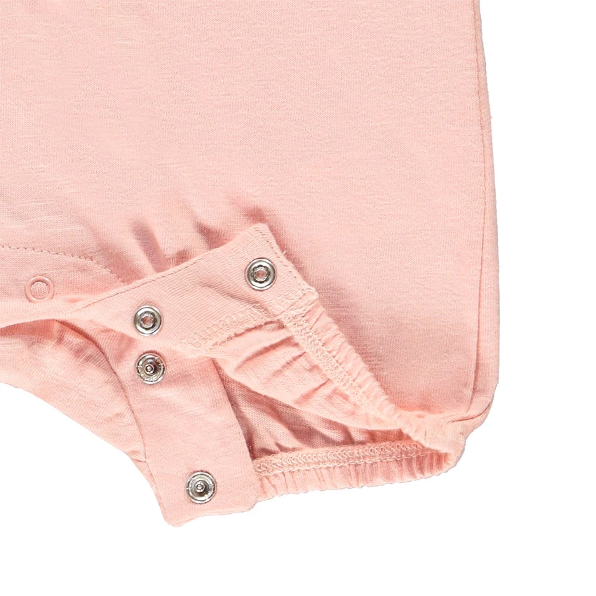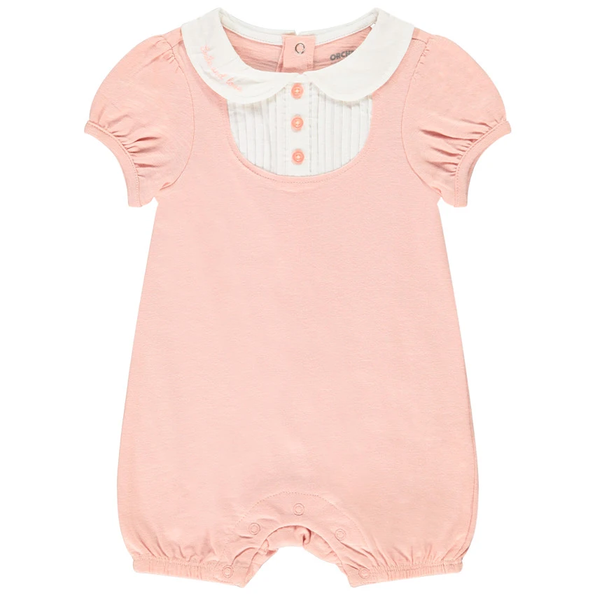 Combinaison courte. Col claudine avec broderie contrastée. Ouverture boutonnée et plastron sur le devant. Manches courtes arrondies. Ouverture pressionnée dans le dos et à l’entrejambe. Cuisses élastiquées.