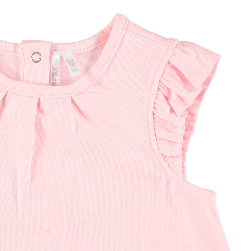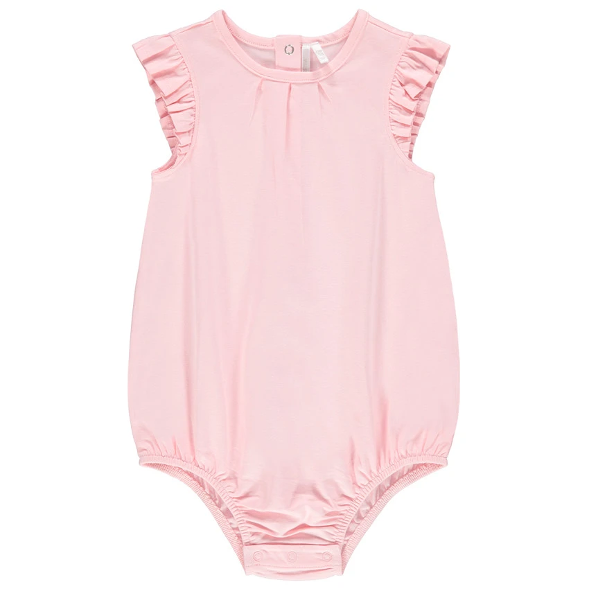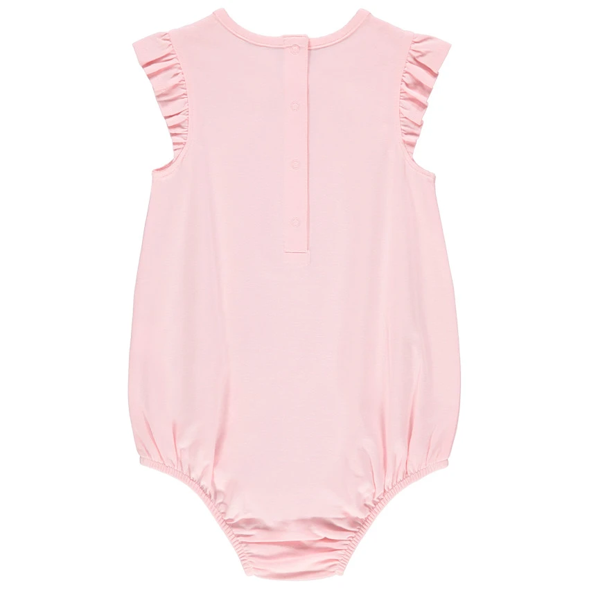 Combinaison courte rose pour bébé fille. Coton issu de l’agriculture biologique pour respecter la peau et l’environnement. Encolure ronde. Manches volantées. Entrejambe et dos pressionnés.