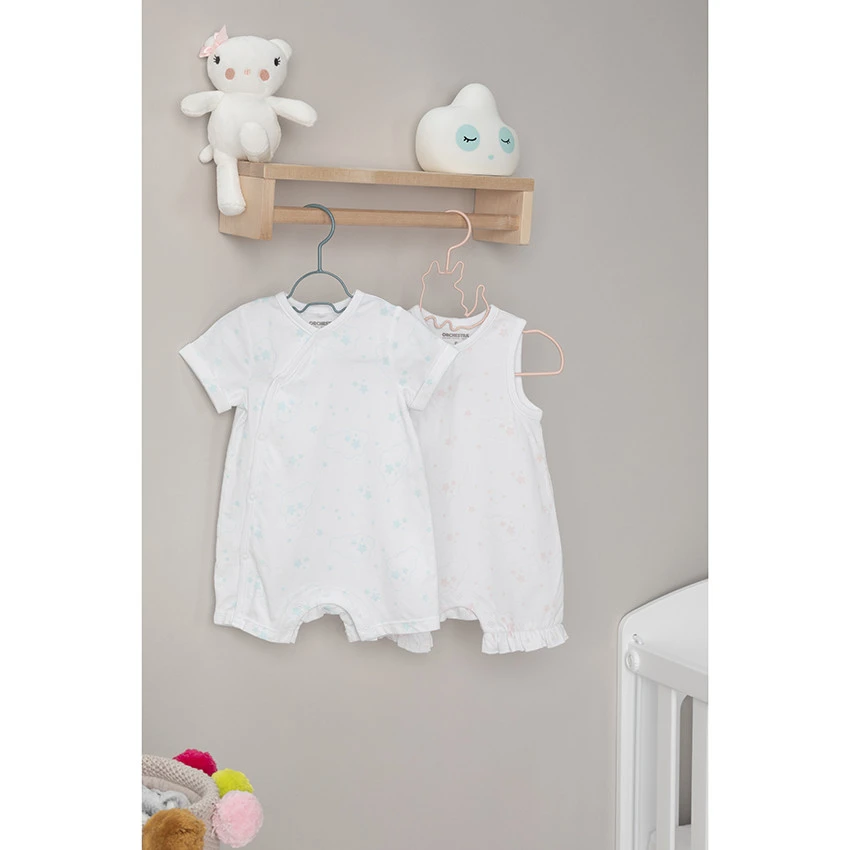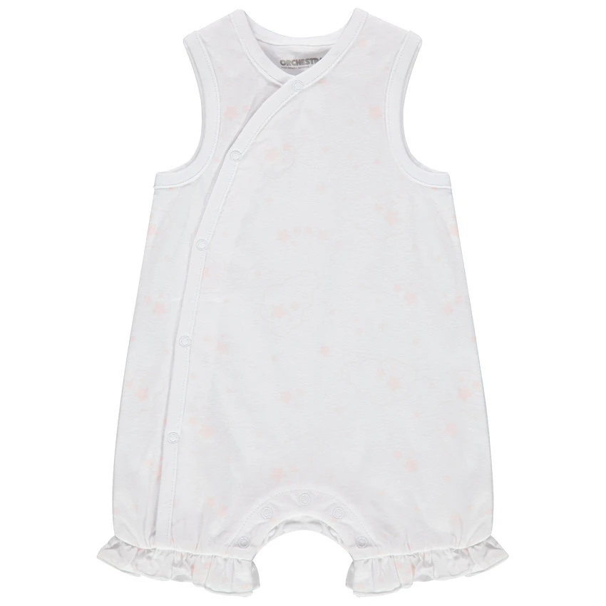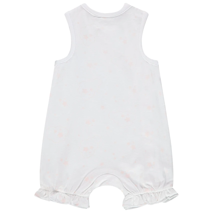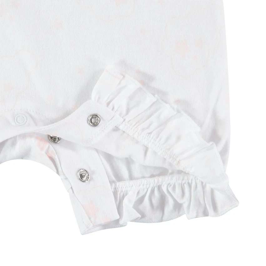 Combinaison courte en coton issu de l’agriculture biologique imprimée étoiles all-over. Ouverture pressionnée devant et à l’entrejambe. Bas des jambes volanté.