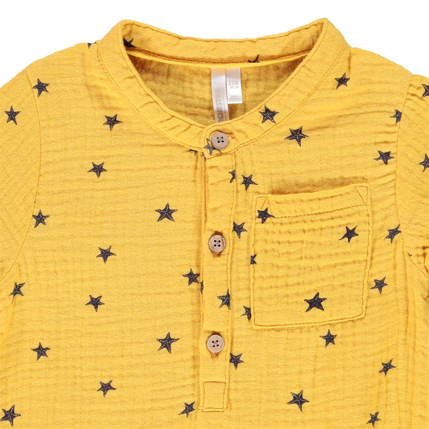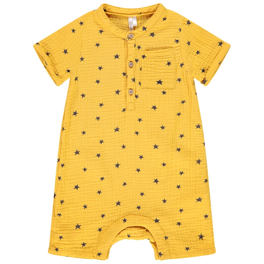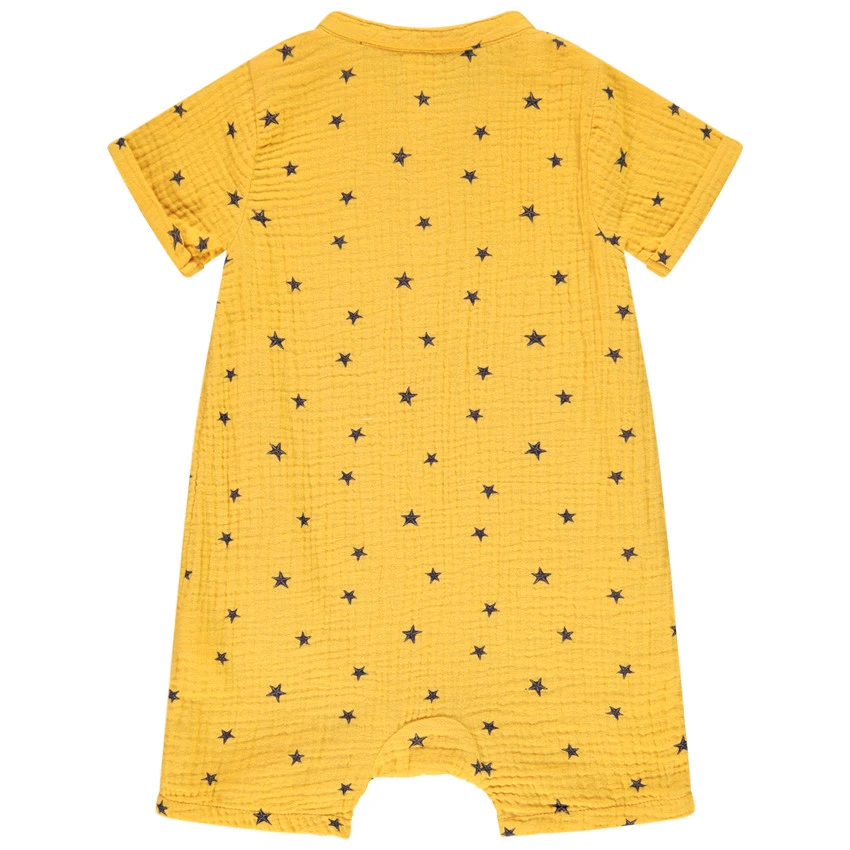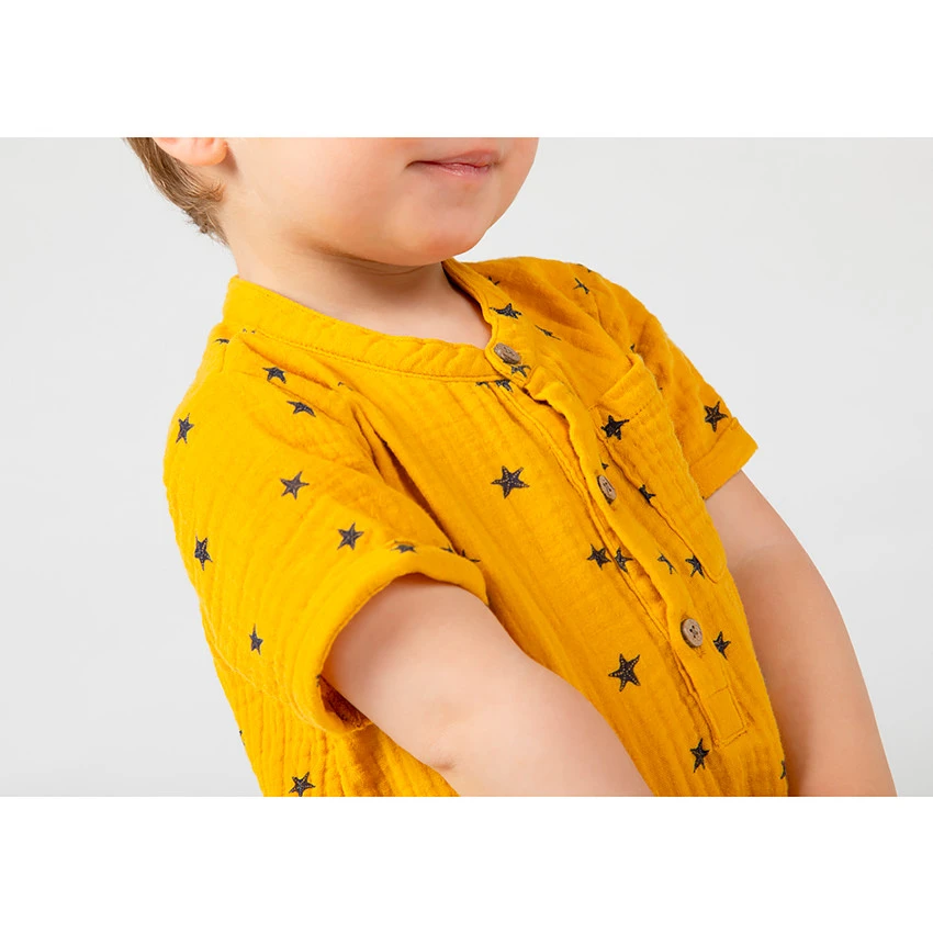 Combinaison courte en double gaze de coton. Col mao. Manches courtes à revers. Ouverture boutonnée sur le devant. Une poche plaquée sur la poitrine. Ouverture pressionnée à l’entrejambe. Imprimé étoiles all-over.
