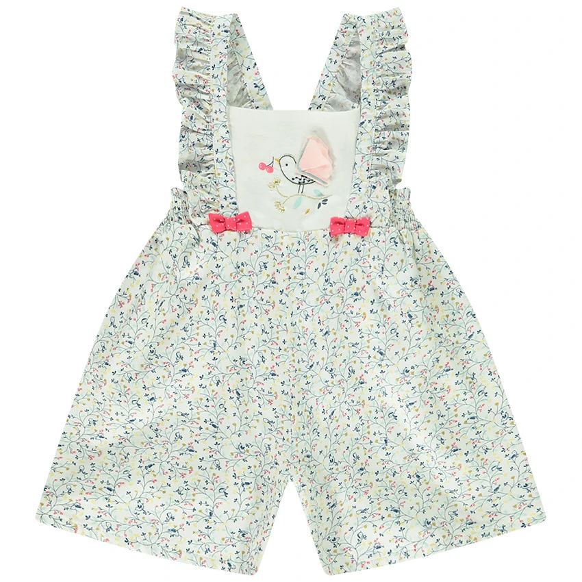 Combinaison courte. Bretelles volantées et croisées dans le dos. Encolure et poitrine unies. Broderie petit oiseau avec ailes en relief. Deux noeuds fantaisie contrastées sur le devant. Dos élastiqué. Imprimé fleuri all-over.