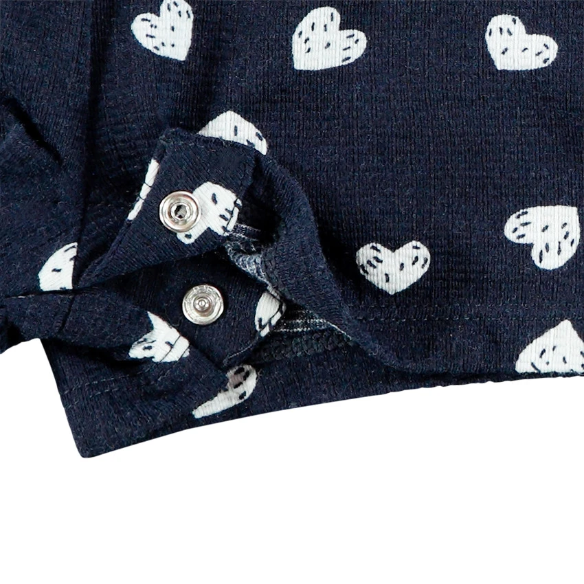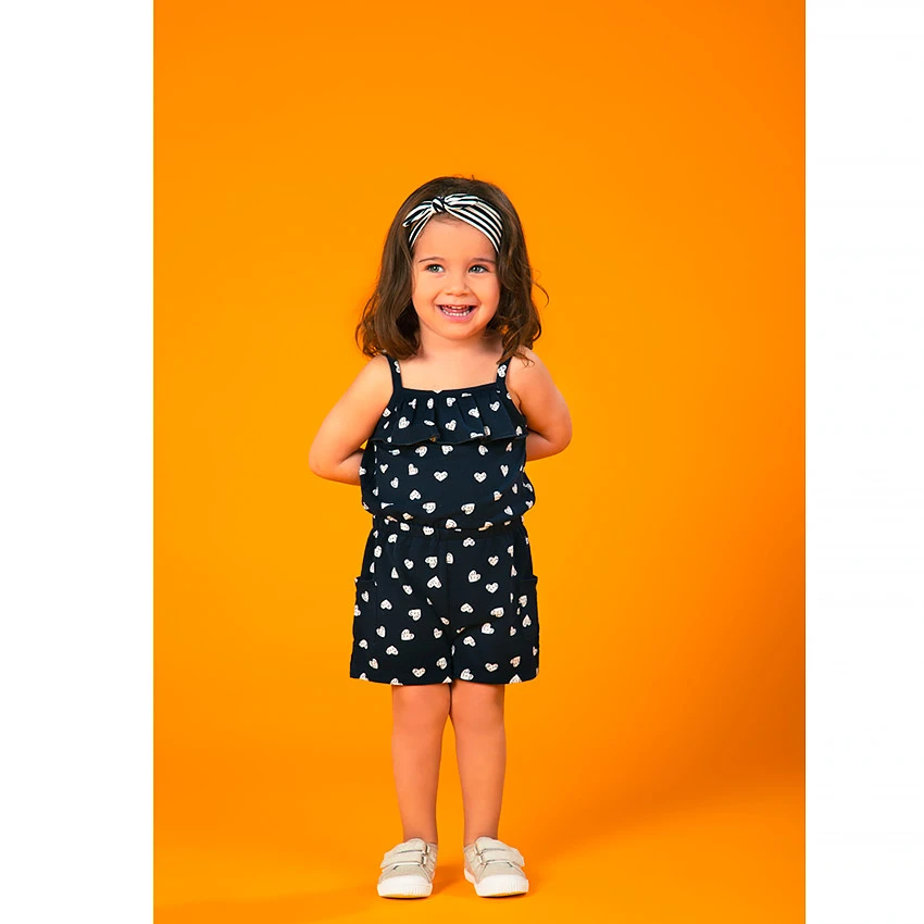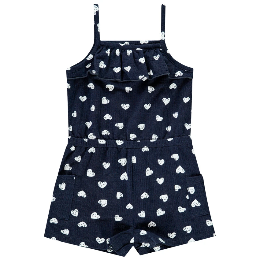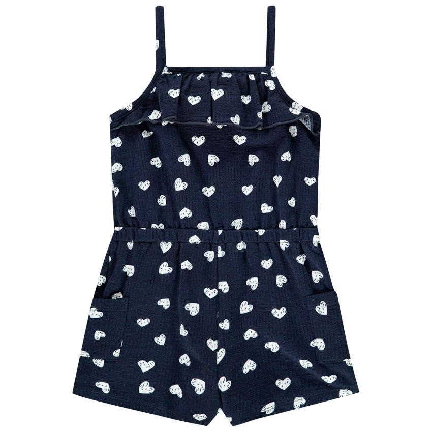 Combinaison courte à fines bretelles. Col droit volanté. Imprimé coeurs all-over. Taille élastiquée. 2 poches sur les côtés. Ouverture pressionnée à l’entrejambe.