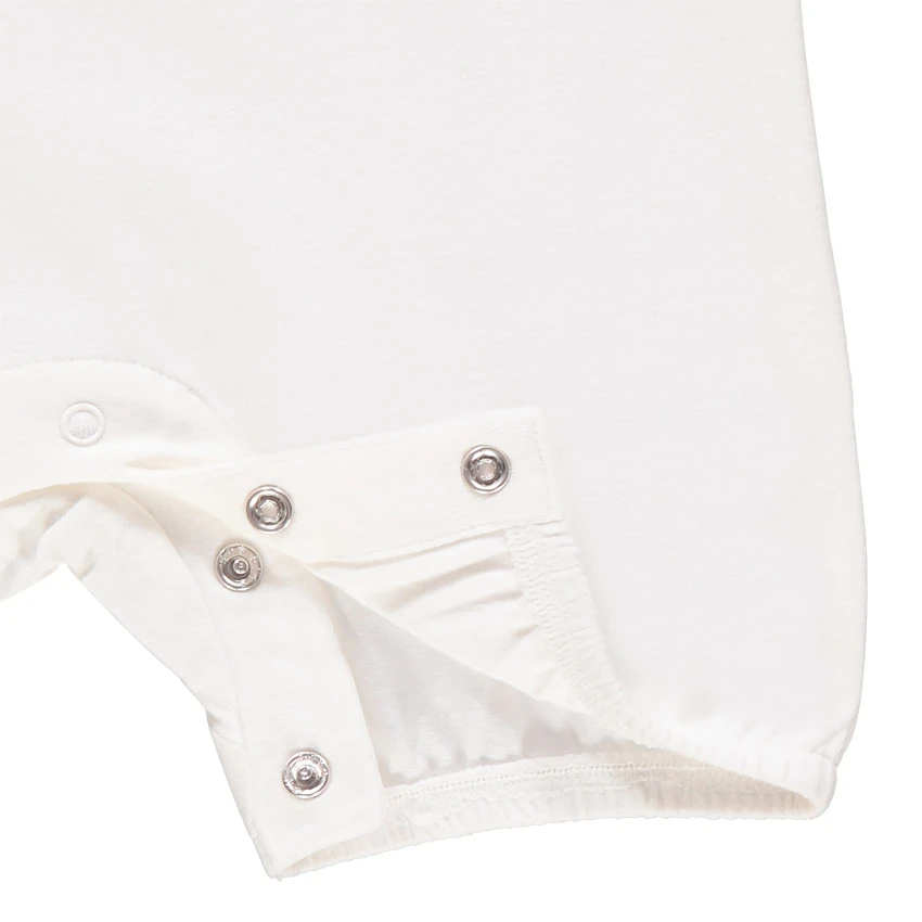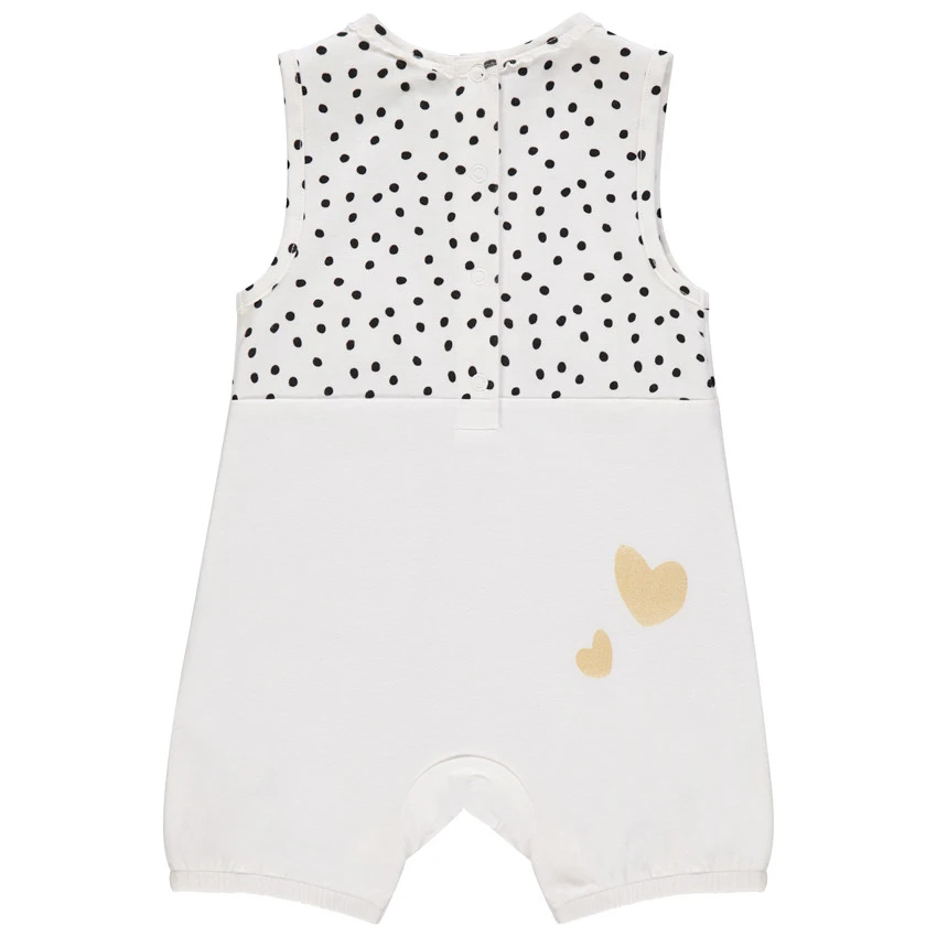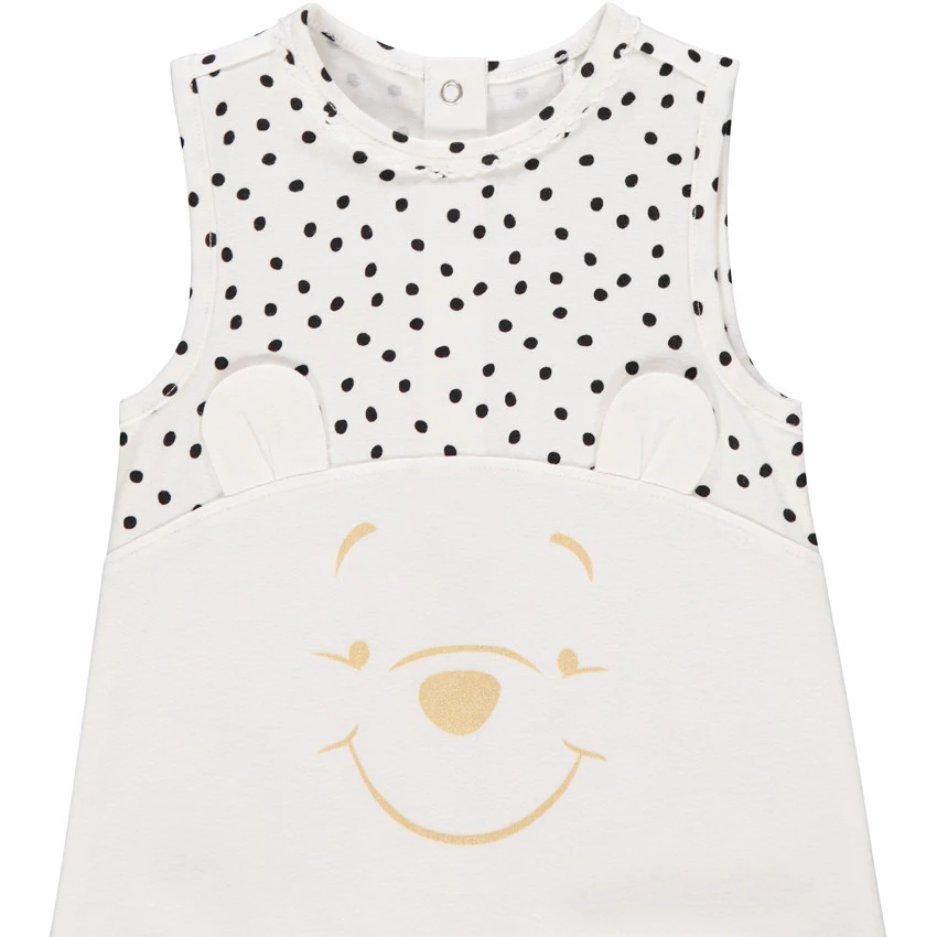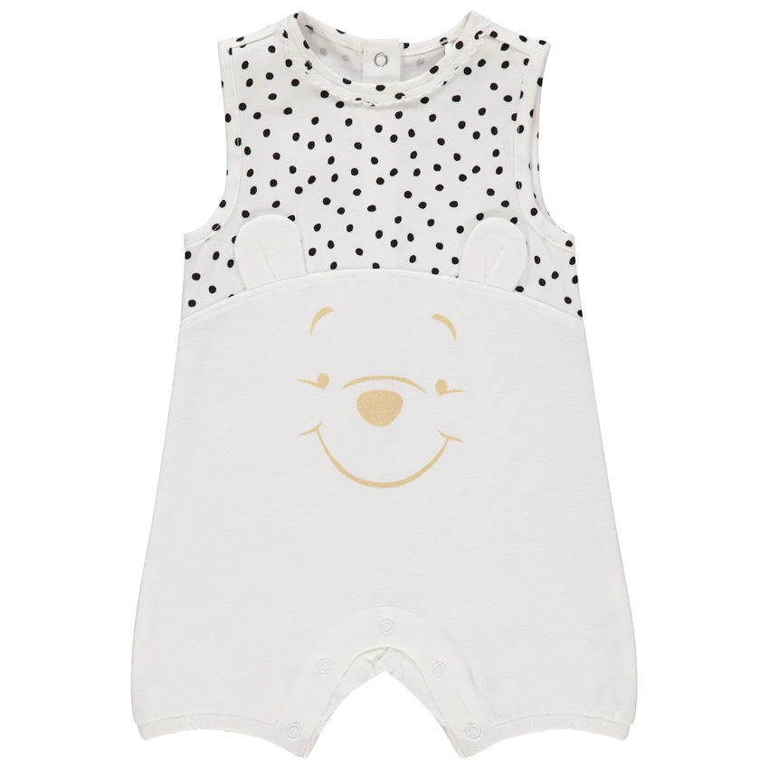 Combinaison sans manches. Encolure ronde finition fantaisie. Pois placés sur le haut de la combinaison. Print Winnie avec découpe et oreilles en relief sur le devant. Entrejambe et dos pressionnés.