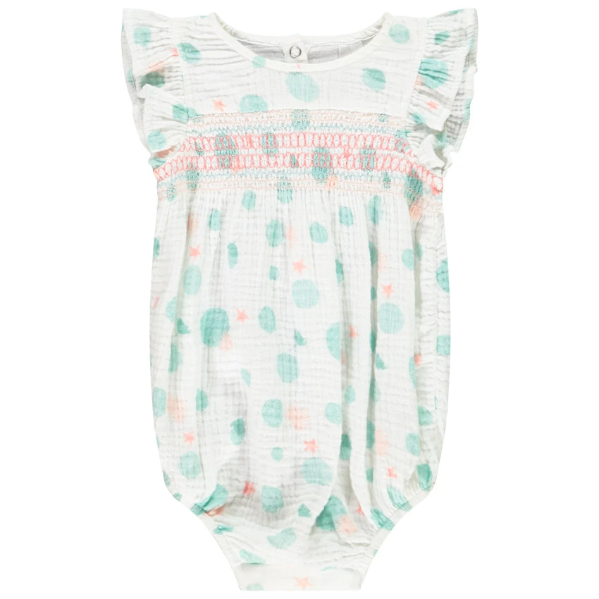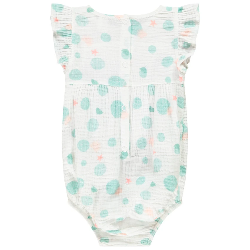 Combinaison courte sans manche. Col rond. Motif pois all-over. Epaules volantées.