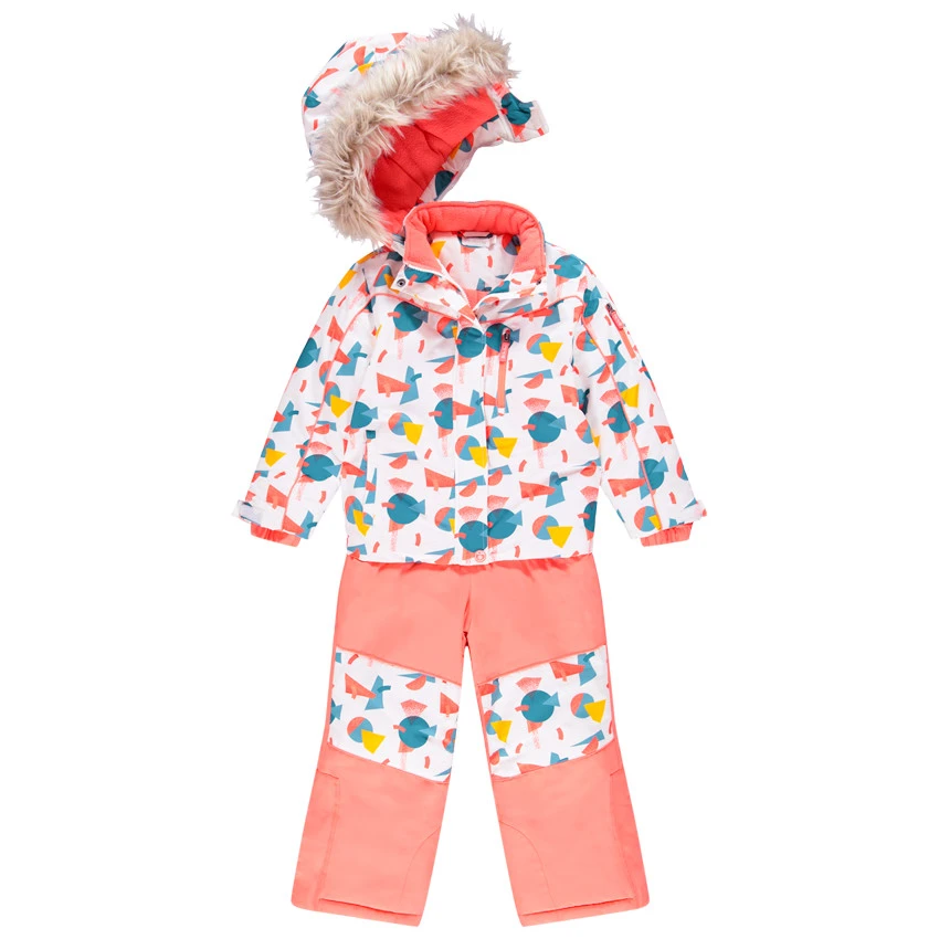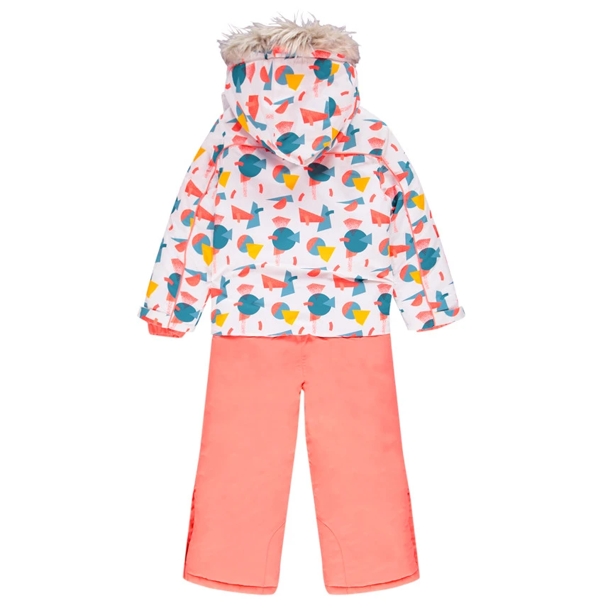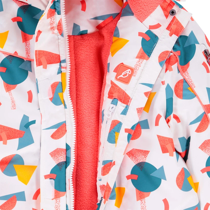 Partie du haut forme blouson de ski. Imperméable. Capuche amovible par zip. Col montant pressionné. Doublure en micropolaire. Fausse fourrure sur le bord de la capuche. Ouverture zippée sous patte patte à scratch. Motif graphique all-over. 1 poches zippée devant. 1 poche forfait sur la manche. Intérieur des poignets élastiqués. Badge gomme et poche zippée à l’intérieur pour y ranger les lunettes et d’autres petites affaires. Soufflet élastiqué pour une isolation parfaite.
