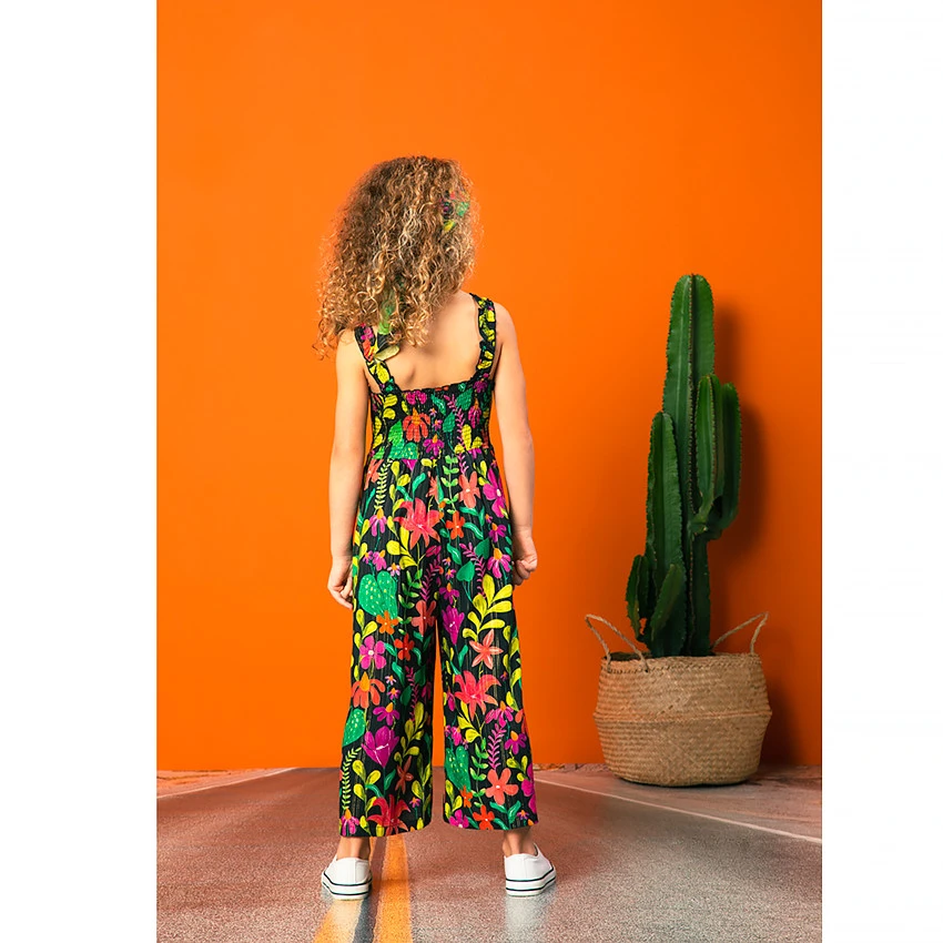 Combinaison longue imprimée. Bretelles fines volantées. Poitrine et dos élastiqués. Jambes larges. Liserés brillants. Imprimé fleuri all-over.
