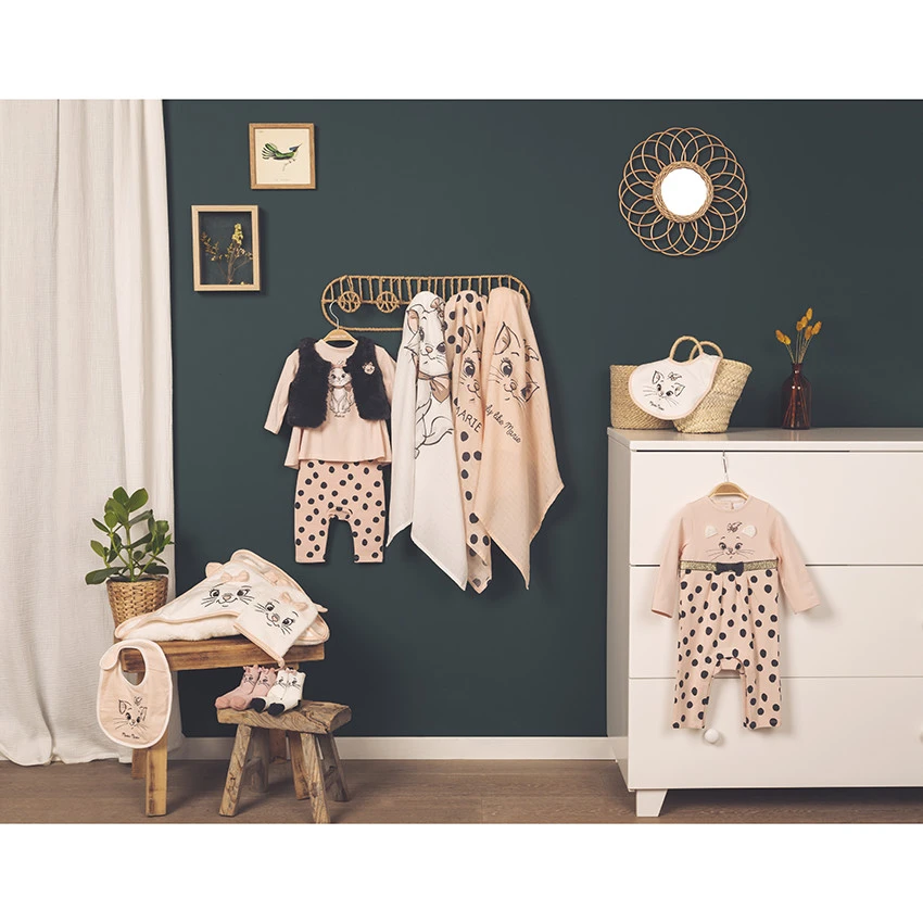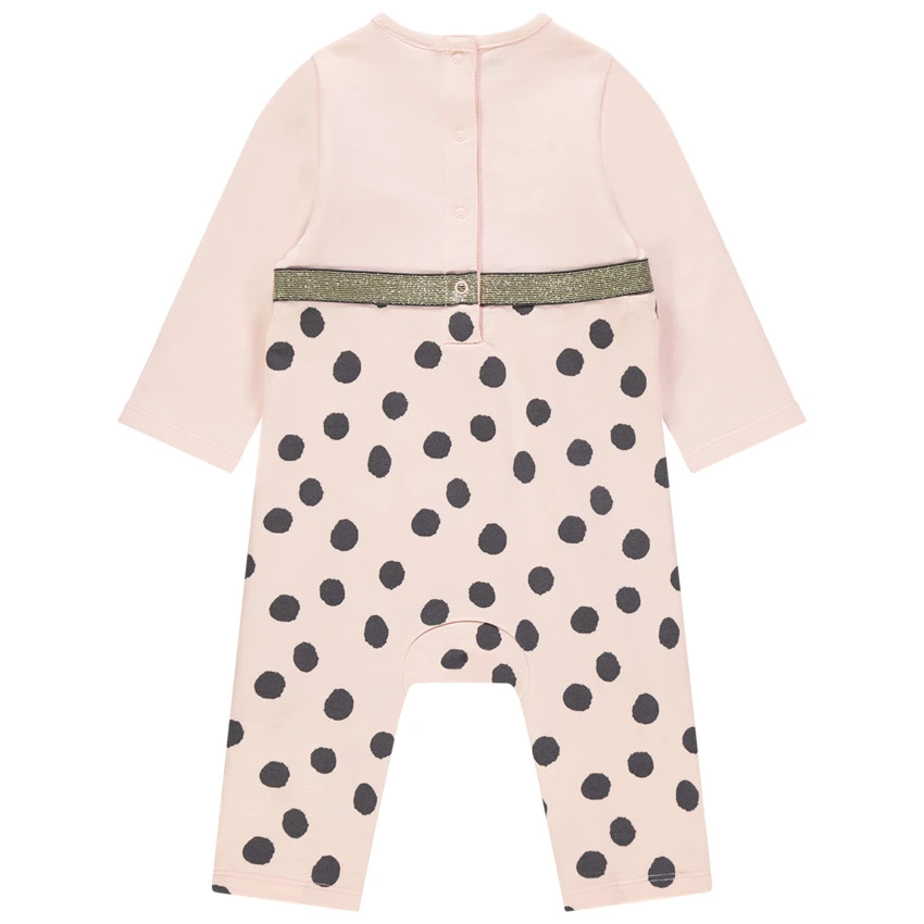 Combinaison longue pour bébé fille. Coton issue de l’agriculture biologique pour préserver la peau et l’environnement. Encolure ronde en bord-côte. Print Marie sur le devant avec oreilles en relief. Biais pailleté avec noeud sous la poitrine. Pois placés. Ouverture pressionnée au dos et à l’entrejambe.