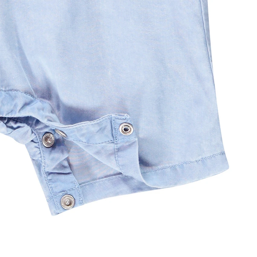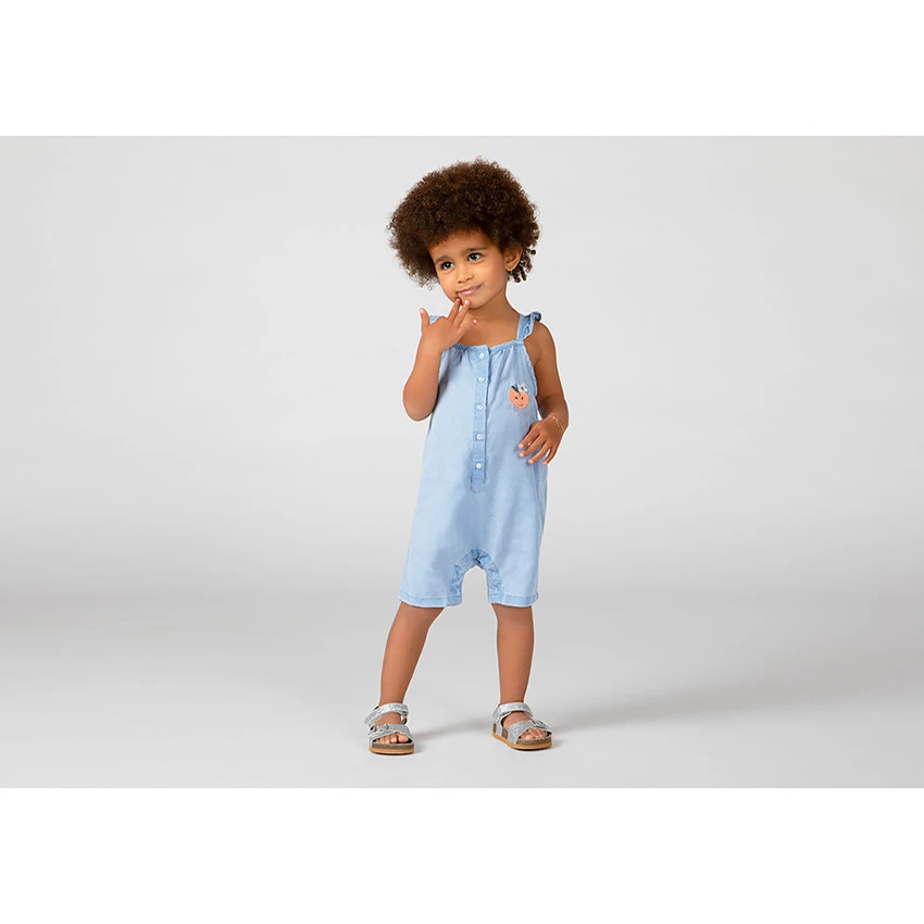 Combishort effet jean. Bretelles fines volantées et croisées dans le dos. Broderie « Sweety peach » sur la poitrine. Ouverture boutonnée sur le devant. Ouverture pressionnée à l’entrejambe.