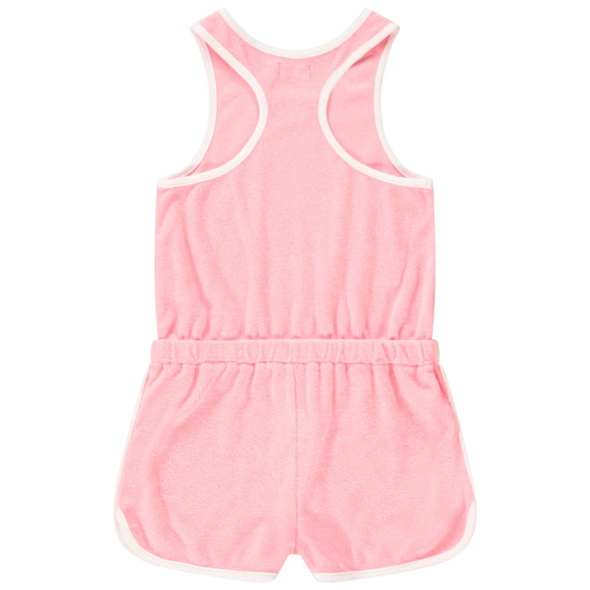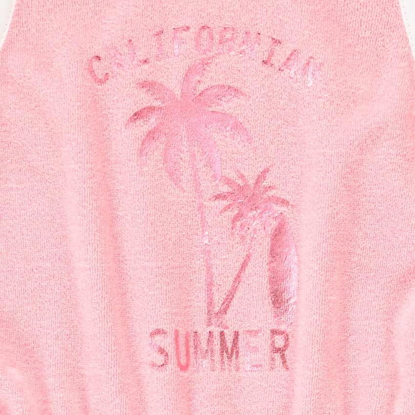 Combishort en éponge. Haut débardeur. Encolure ronde et emmanchures avec biais contrasté. Print brillant sur le devant. Short avec taille élastiquée. Biais contrasté sur les jambes.