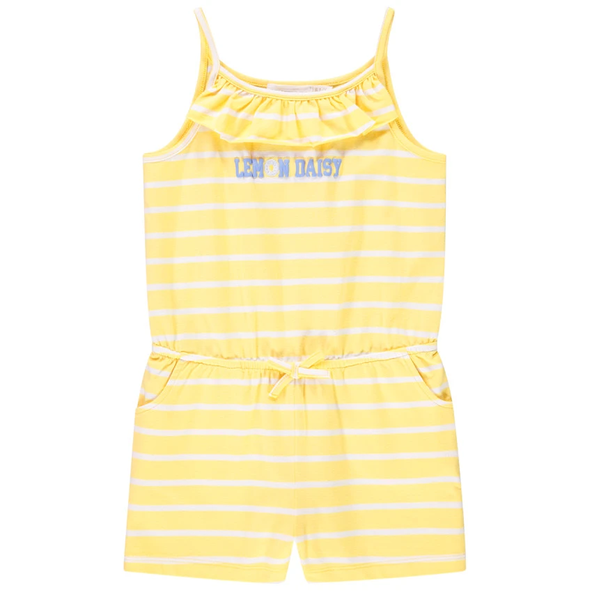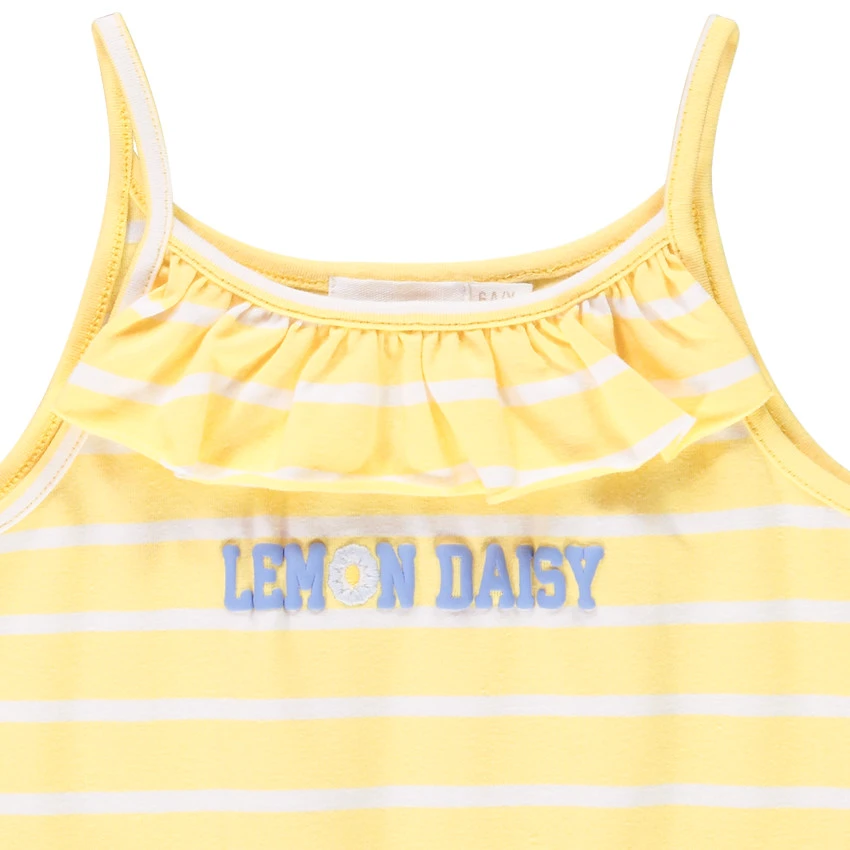 Combishort en jersey. Bretelles fines. Encolure ronde et volantée. Texte en relief. Rayures jaunes et blanches. Taille élastiquée. Noeud fantaisie. Deux poches sur le devant.