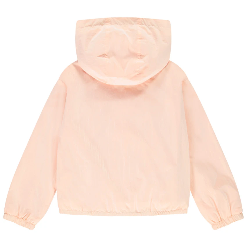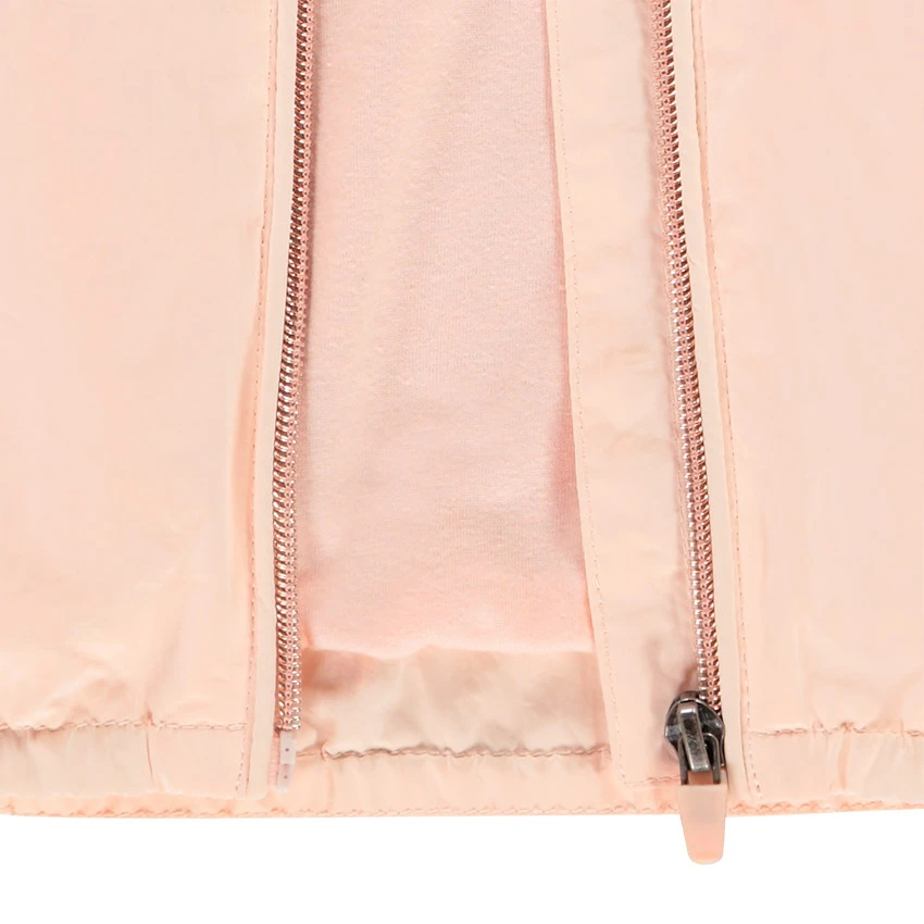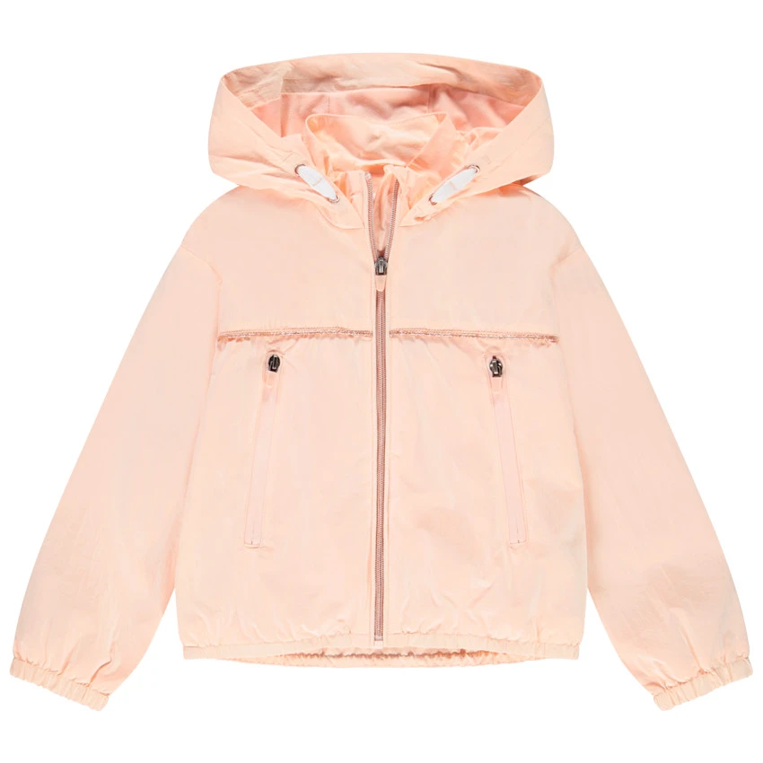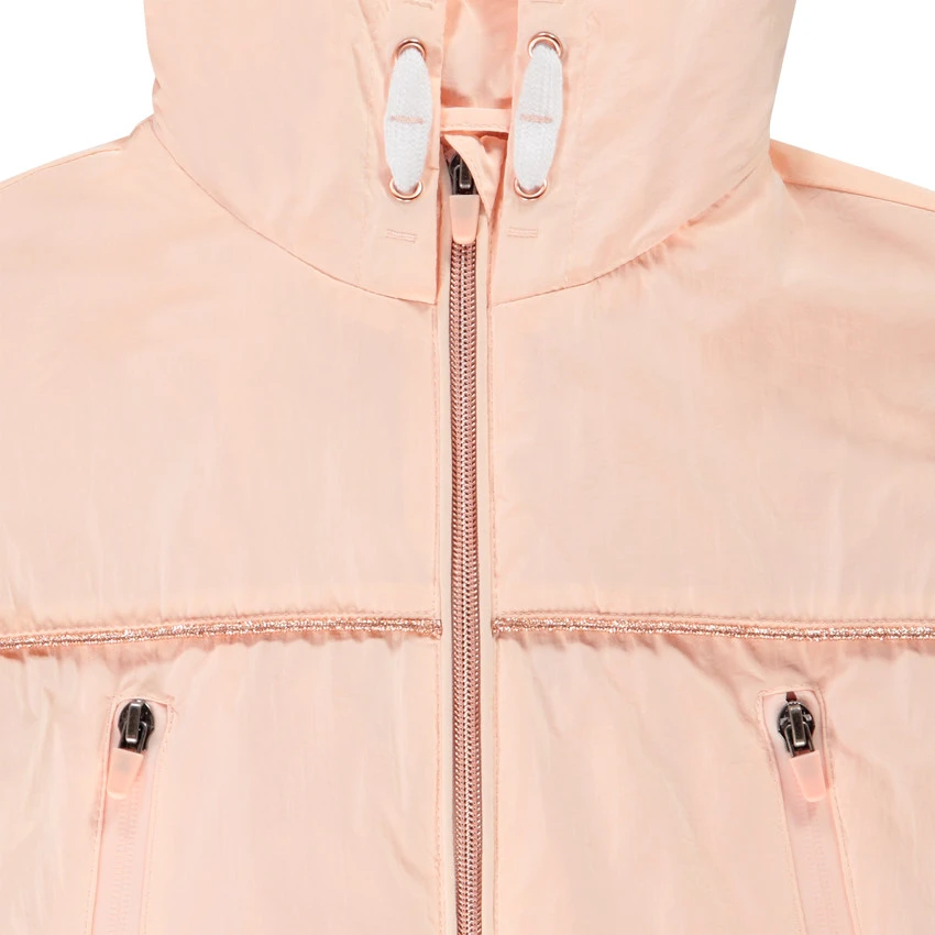 Coupe-vent à capuche avec cordons de serrage. Ouverture zippée sur le devant. 2 poches passepoilées sur le devant. Base et poignets élastiqués. Doublure jersey. Liseré brillant au niveau de la poitrine.