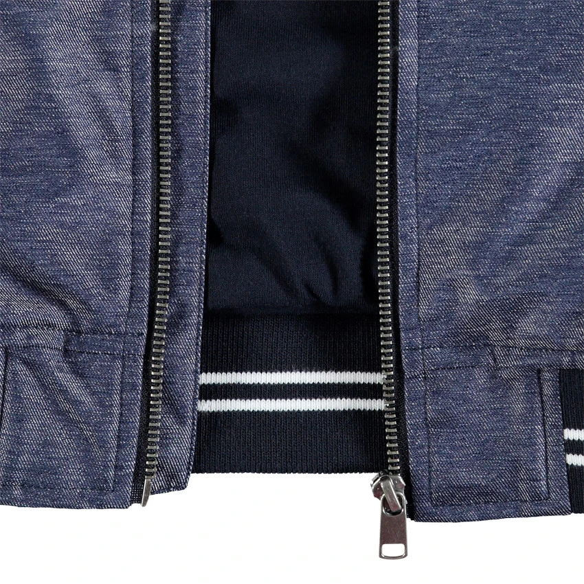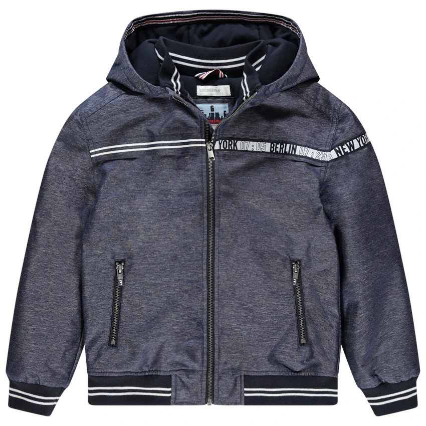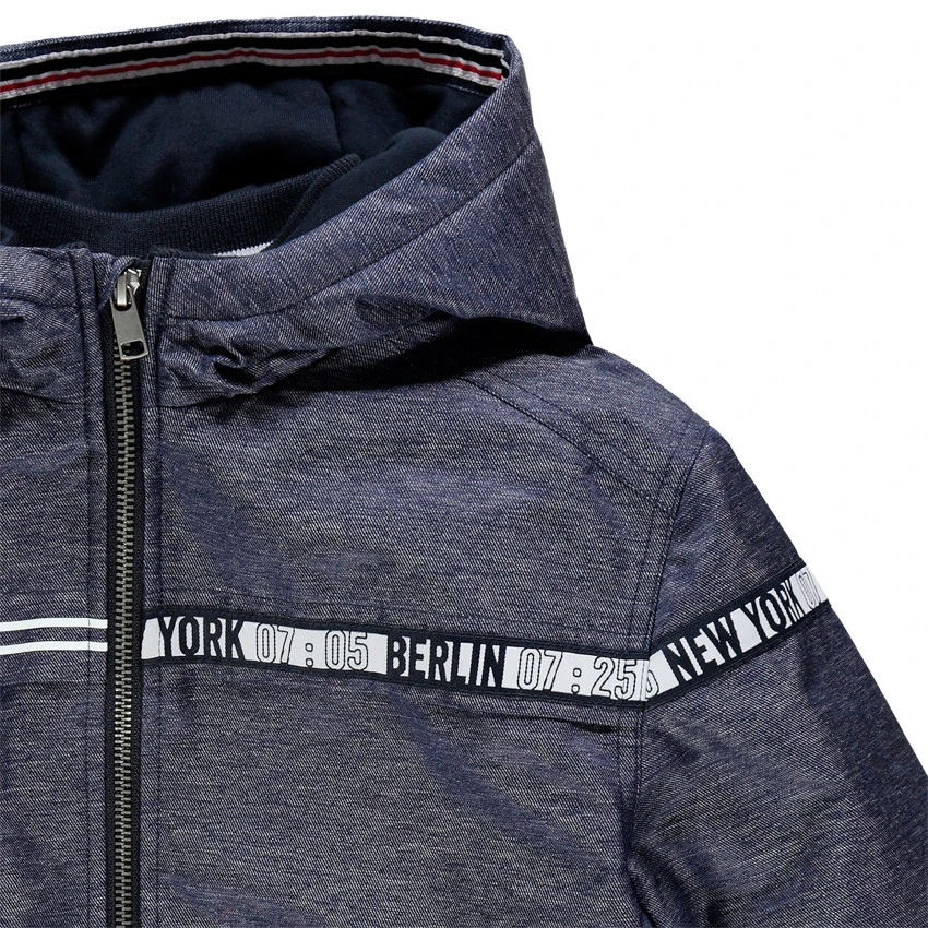 Coupe-vent à capuche. Col montant en bord-côte. Ouverture zippée devant. Doublure en jersey. Bande imprimée sur le haut du coupe-vent. 2 poches zippées sur le devant. Poignets et base en bord-côte à rayures.
