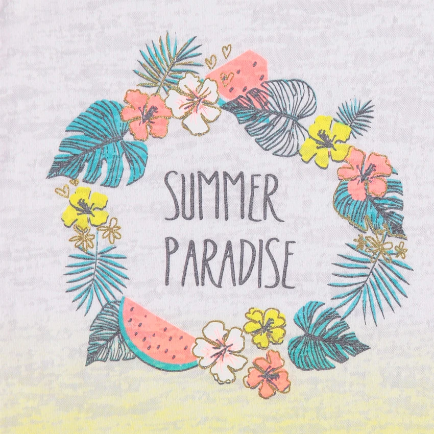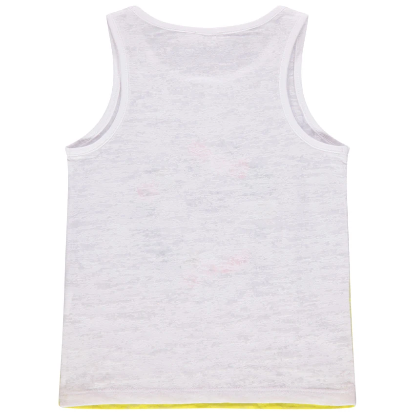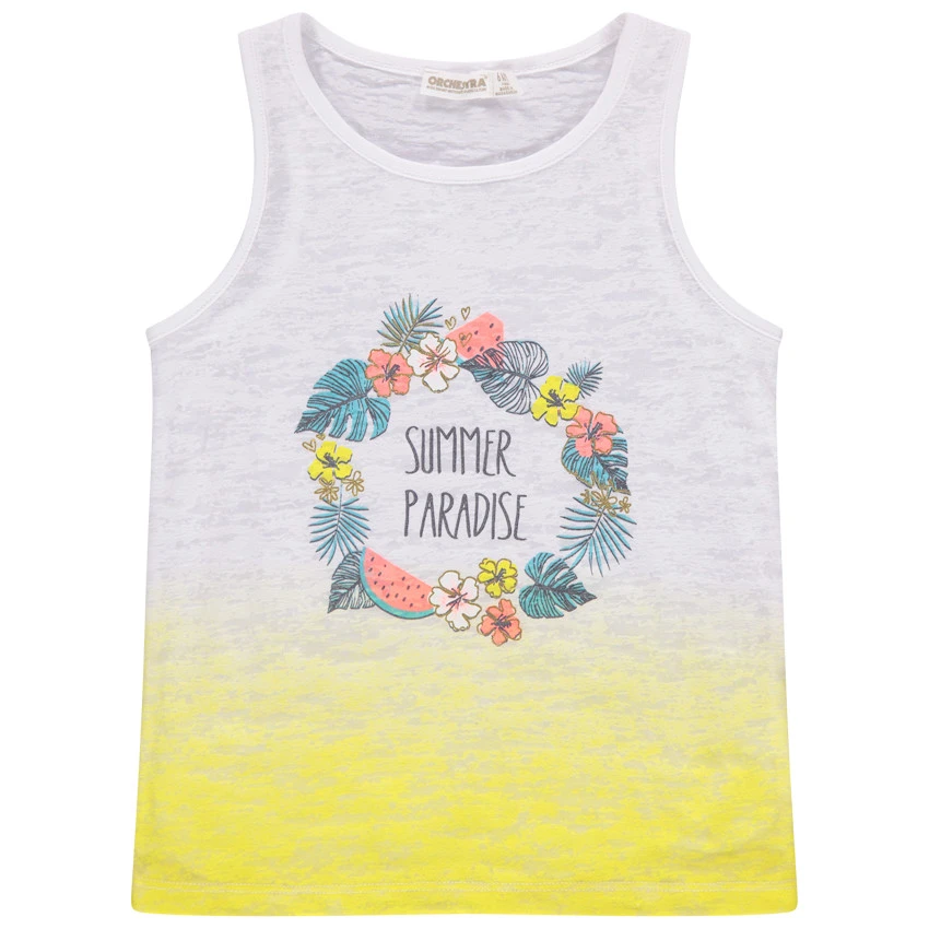 Débardeur effet dévoré. Encolure ronde en bord-côte. Effet tie and dye. Couronne végétale printée sur le devant.