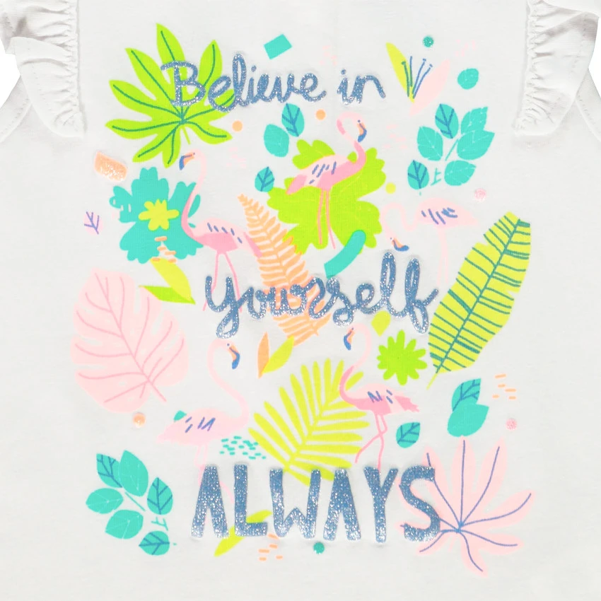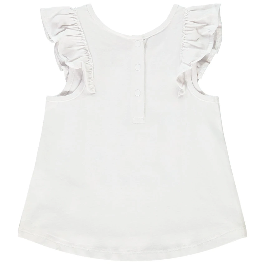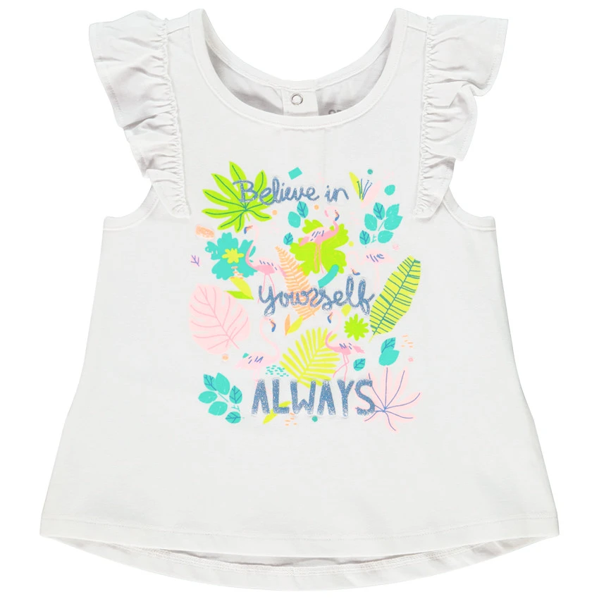 Débardeur manches courtes volantées. Encolure ronde. Print et inscription brillante sur le devant. Ouverture pressionnée dans le dos.