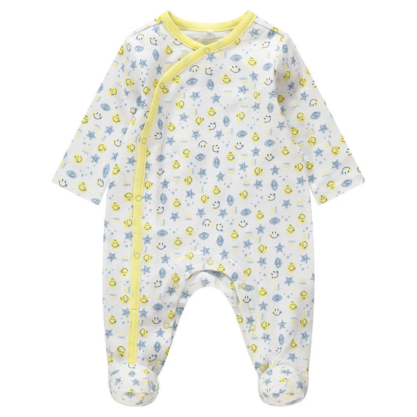 Dors-bien en coton bio. Imprimé Smiley all-over. Ouverture pressionnée devant et à l’entrejambe. Finition biais contrasté.