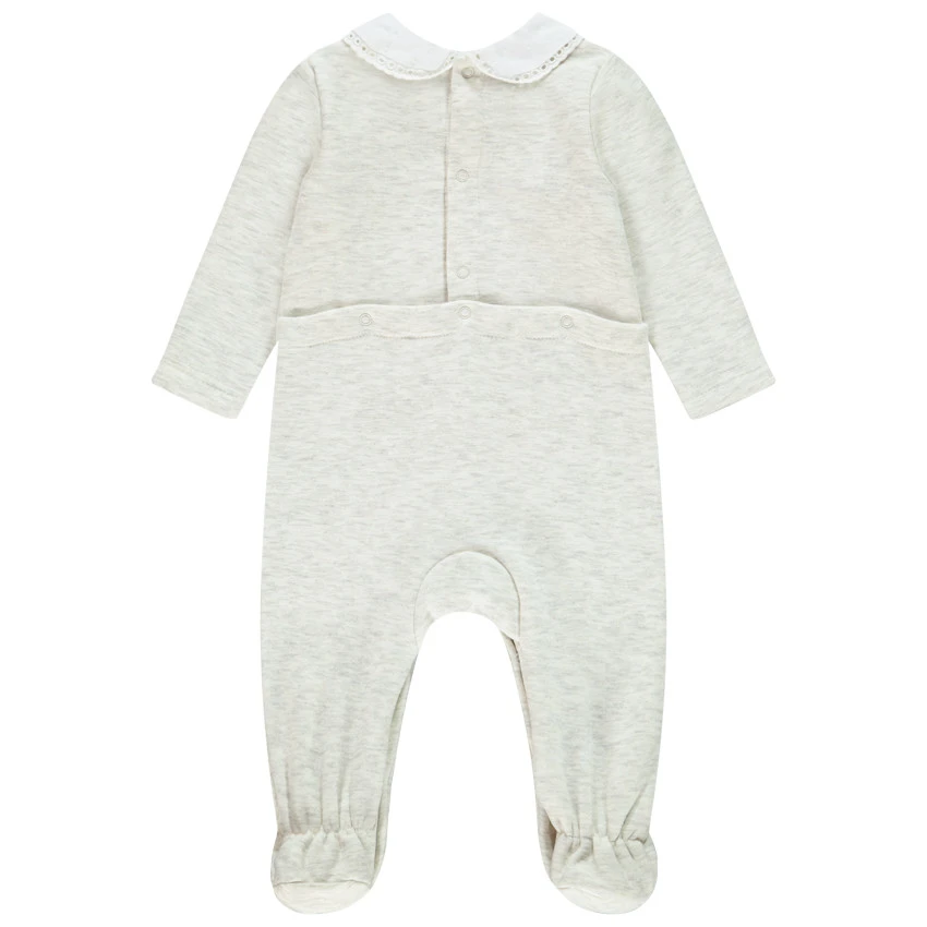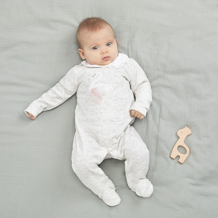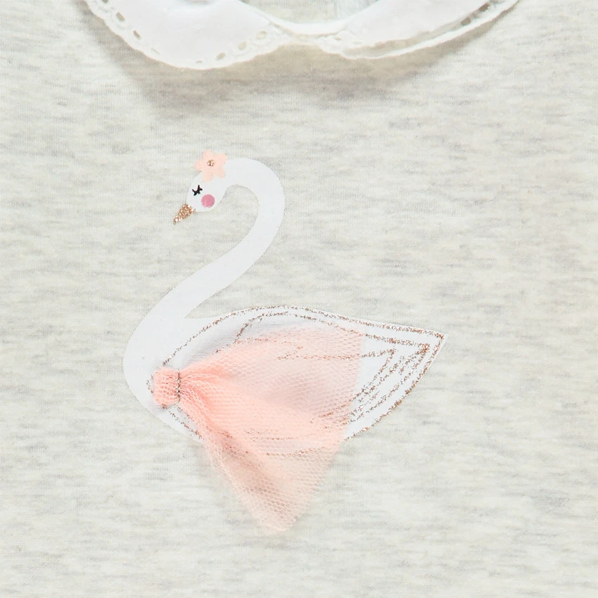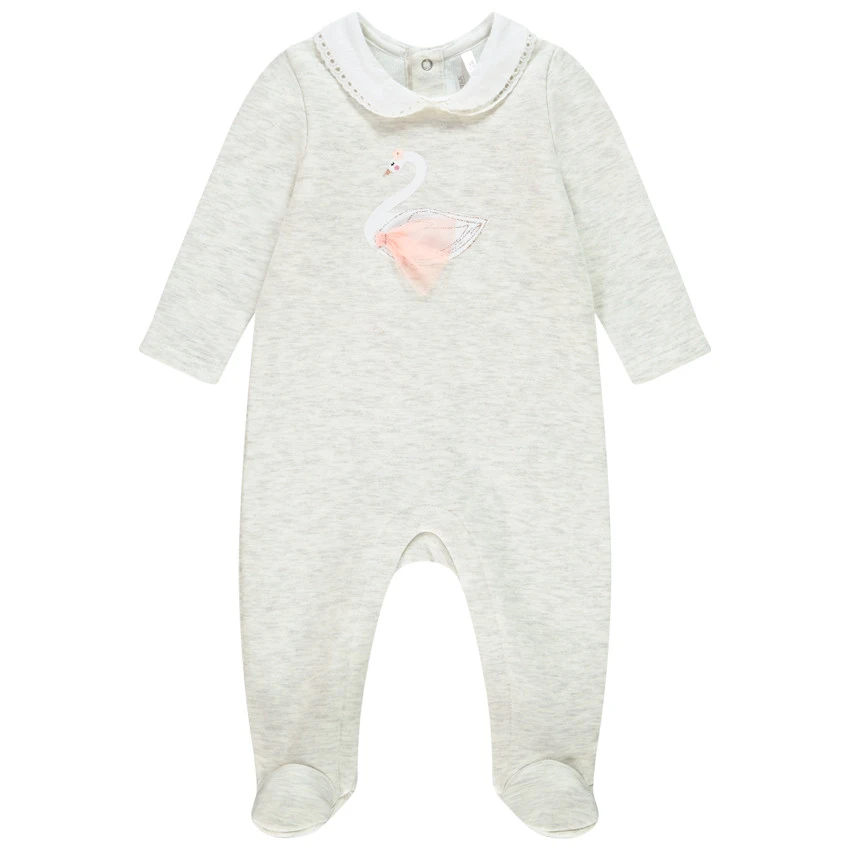 Dors-bien en jersey chiné. Col Claudine fantaisie. Cygne printé avec ailes en relief. Ouverture pressionnée dos et pont pour faciliter l’habillement.