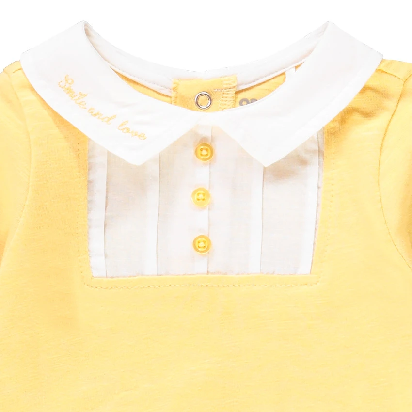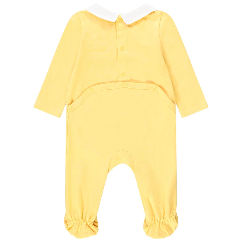 Dors-bien en jersey. Col claudine avec broderie contrastée. Ouverture boutonnée et plastron sur le devant. Couleur unie. Manches longues. Ouverture pressionnée et pont à l’arrière. Pieds fermés.