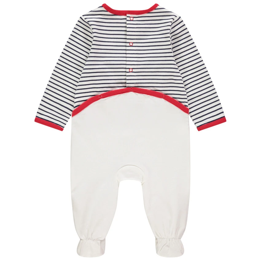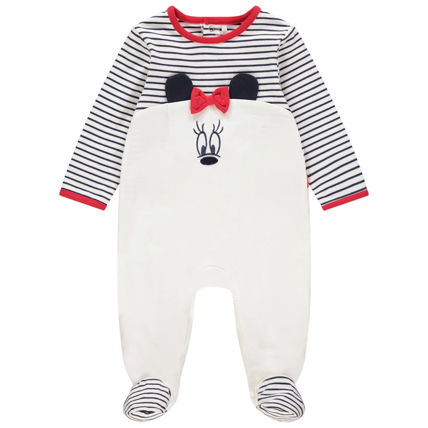 Dors-bien en jersey à rayures placées.Encolure ronde. Minnie brodée devant à détails en relief. Pieds rayés. Ouverture pressionnée dos et pont pour faciliter le change.
