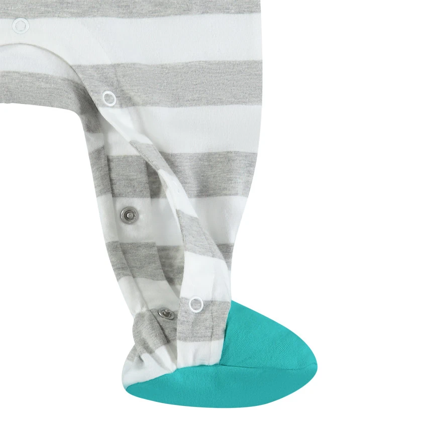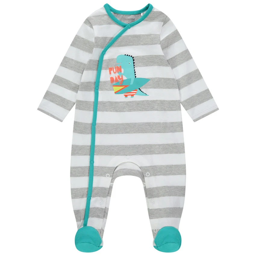 Dors-bien à rayures contrastées. Ouverture pressionnée devant et à l’entrejambe. Dino printé devant avec texte reliéfé. Finition biais bleu.
