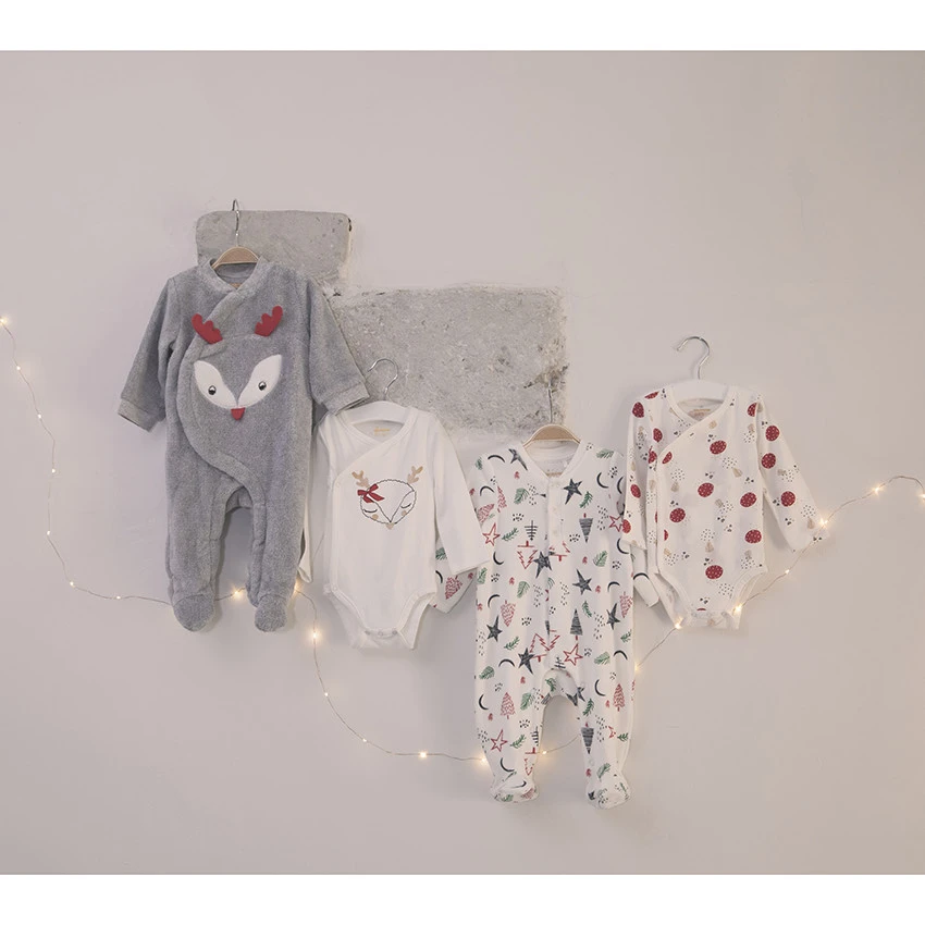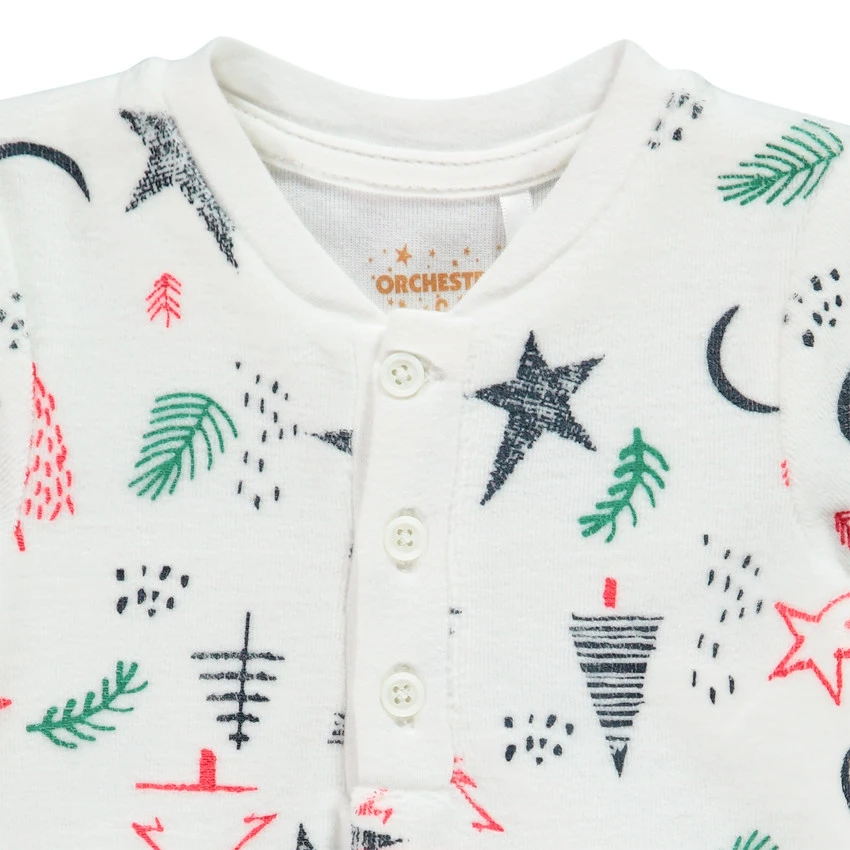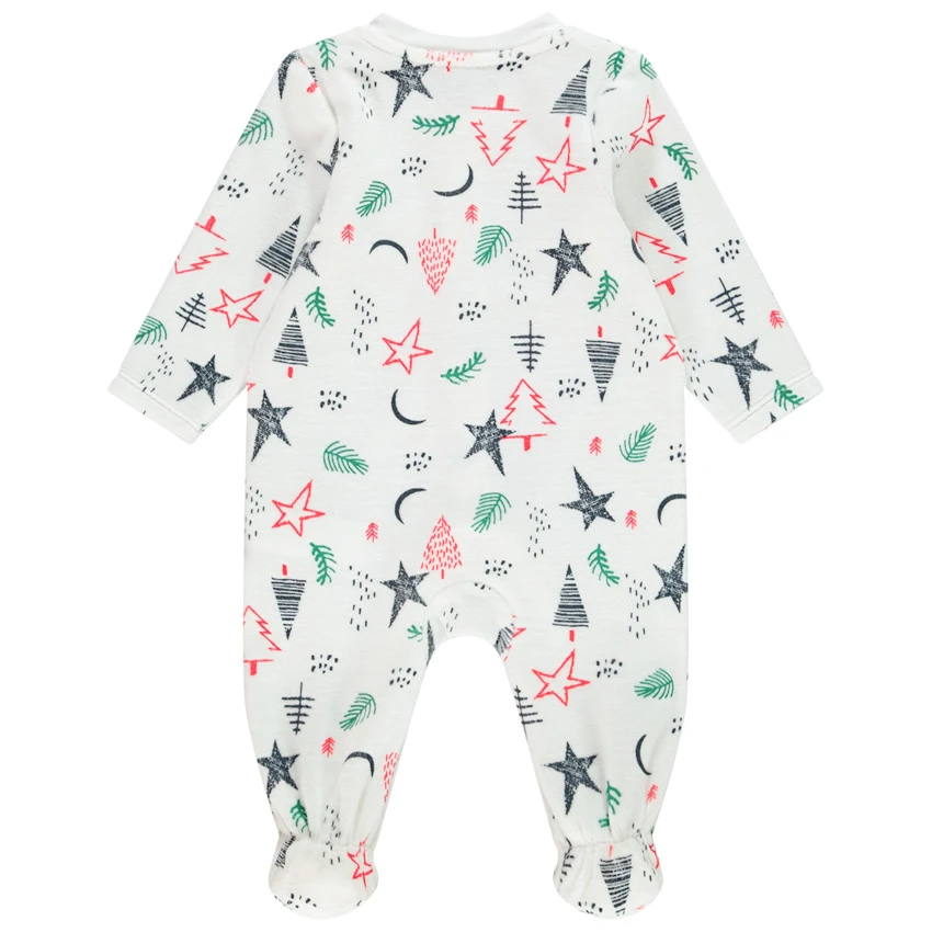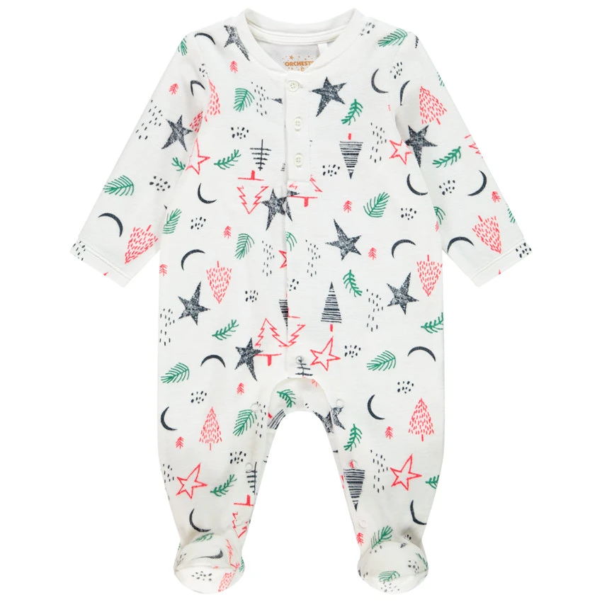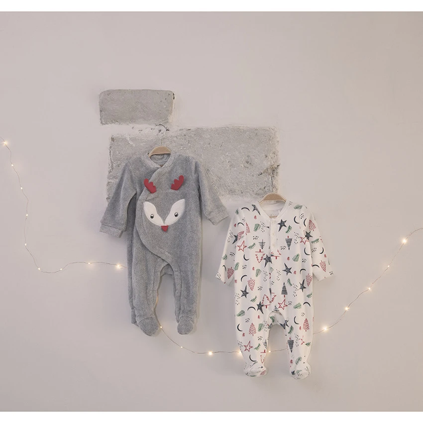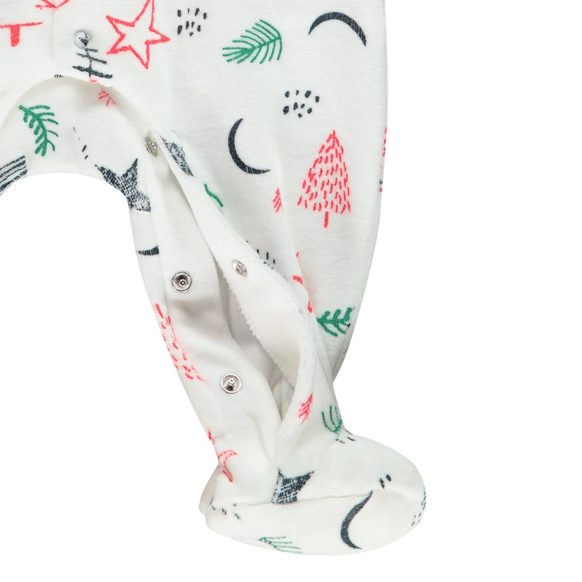 Dors-bien en velours imprimé. Motifs esprit Noël. Col fantaisie à ouverture boutonnée sur le devant. Entrejambe pressionné.