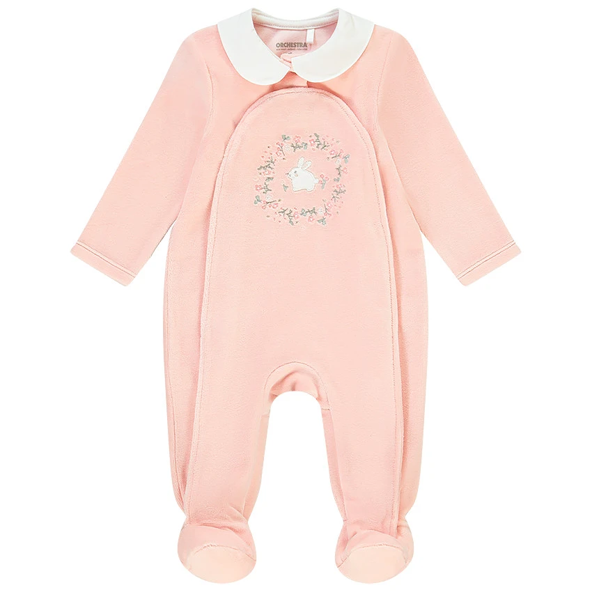 Dors-bien en velours. Col claudine contrasté. Manches longues. Ouverture pressionnée sur tout le devant pour l’enfiler plus facilement. Broderies lapin et fleurs sur le devant.
