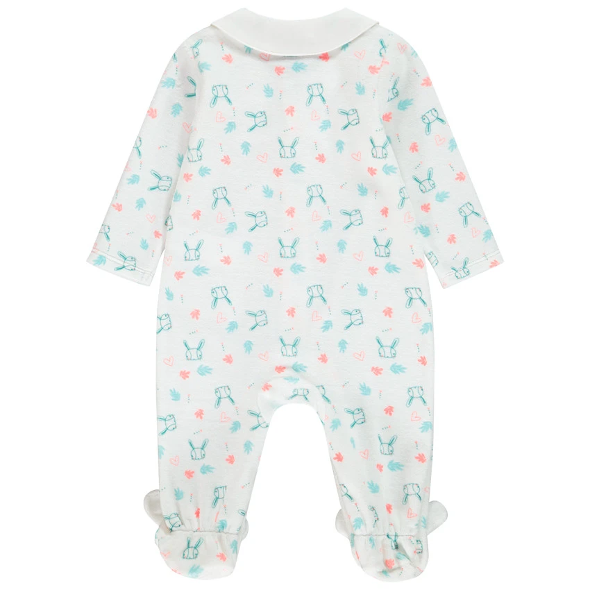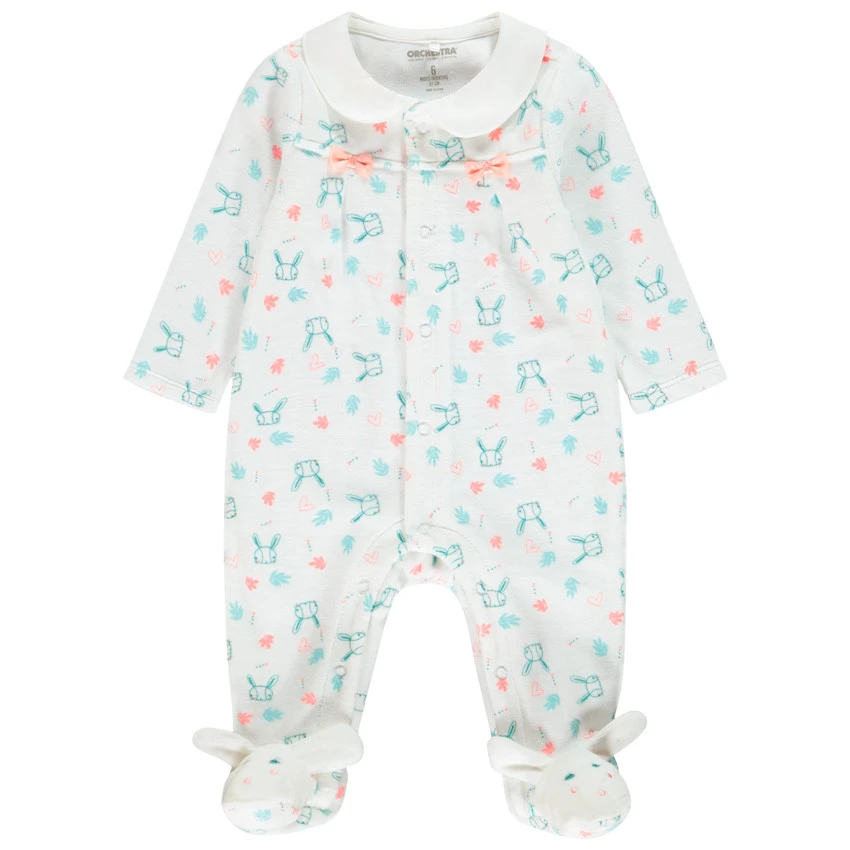 Dors-bien en velours imprimé. Col Claudine. Petits noeuds roses cousus sous l’encolure. Ouverture pressionnée devant et à l’entrejambe pour faciliter le change et l’habillement. Oreilles de lapin en relief sur les pieds.