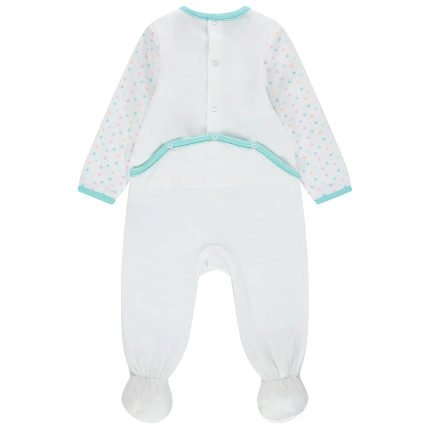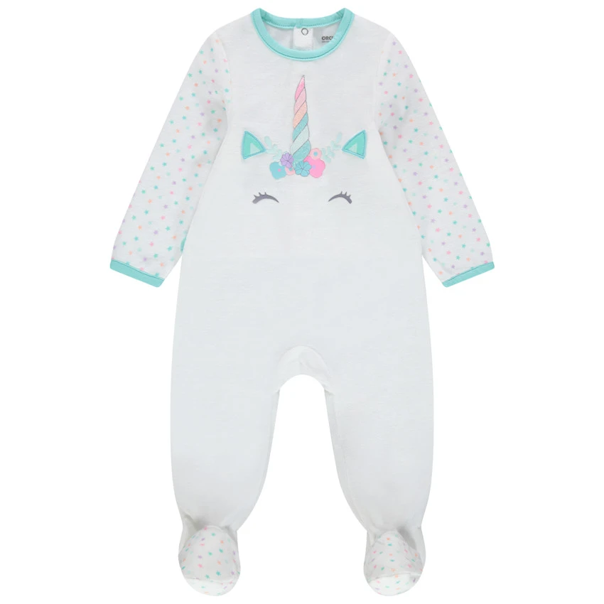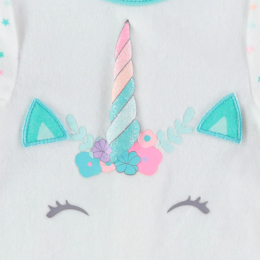 Dors-bien en velours. Encolure ronde en bord-côte bleu. Licorne pailletée printée devant. Pois sur les manches. Ouverture pressionnée dos et pont. Dessus des pieds imprimé.