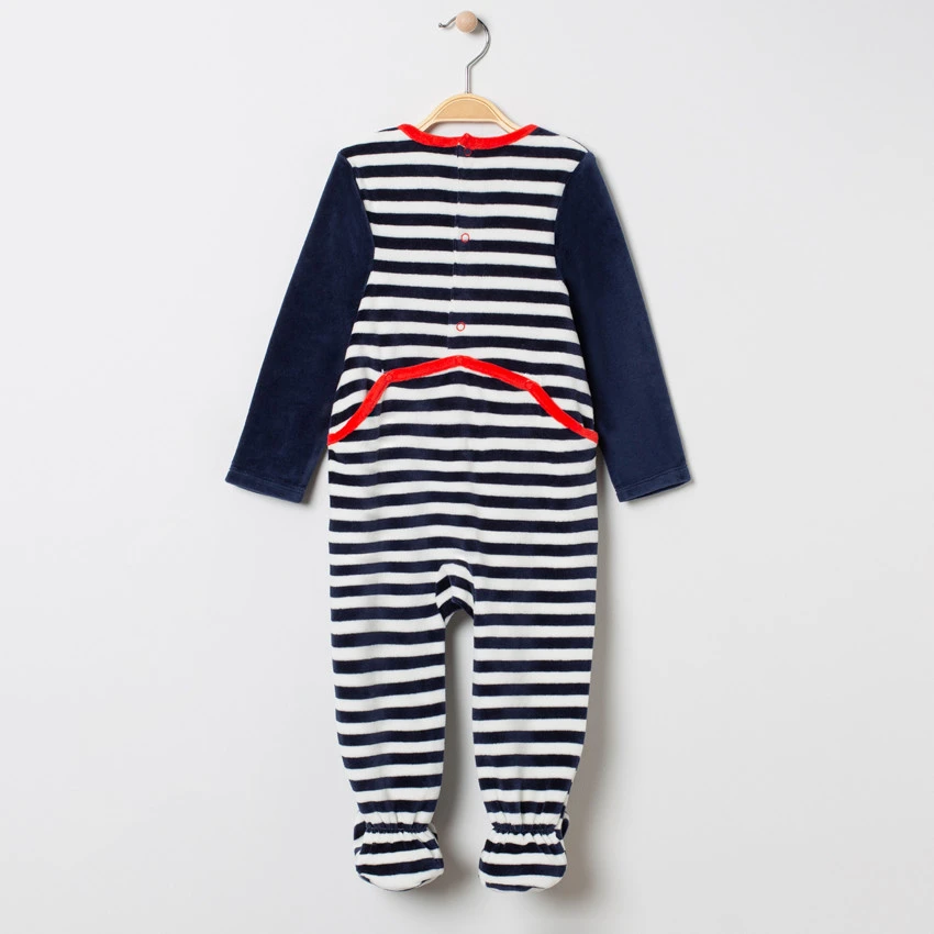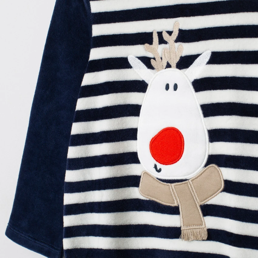 Dors-bien en velours à rayures placées. Encolure rouge. Renne brodé sur le devant. Ouverture pressionnée devant sur toute la longueur du 1 au 6 mois. Ouverture pressionnée dos et pont du 9 au 23 mois pour faciliter l’habillement.