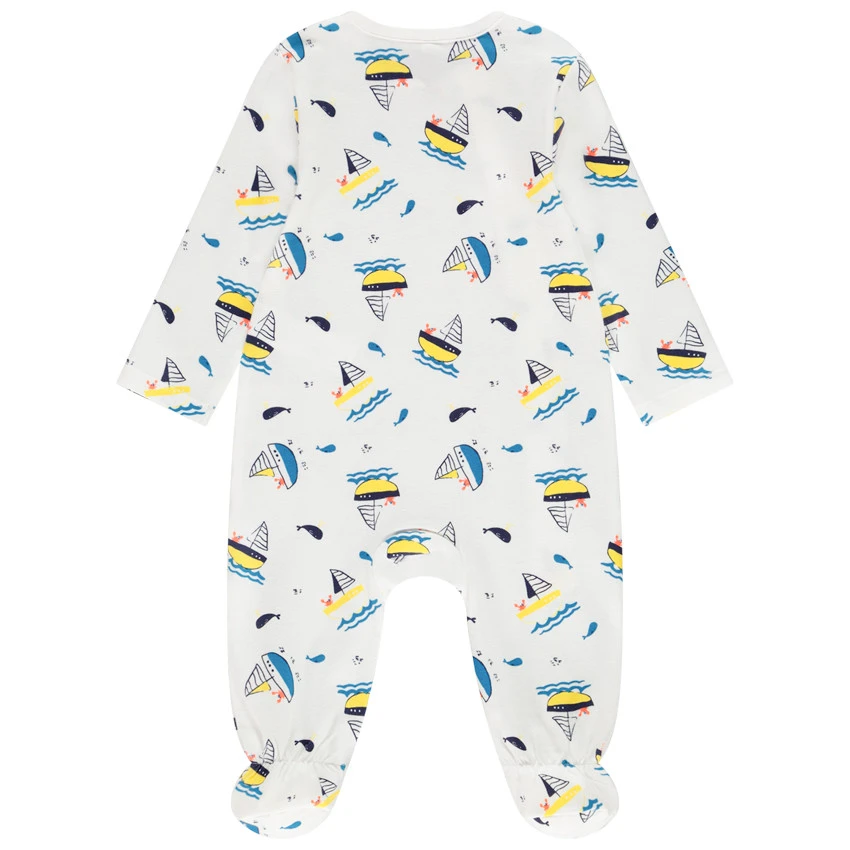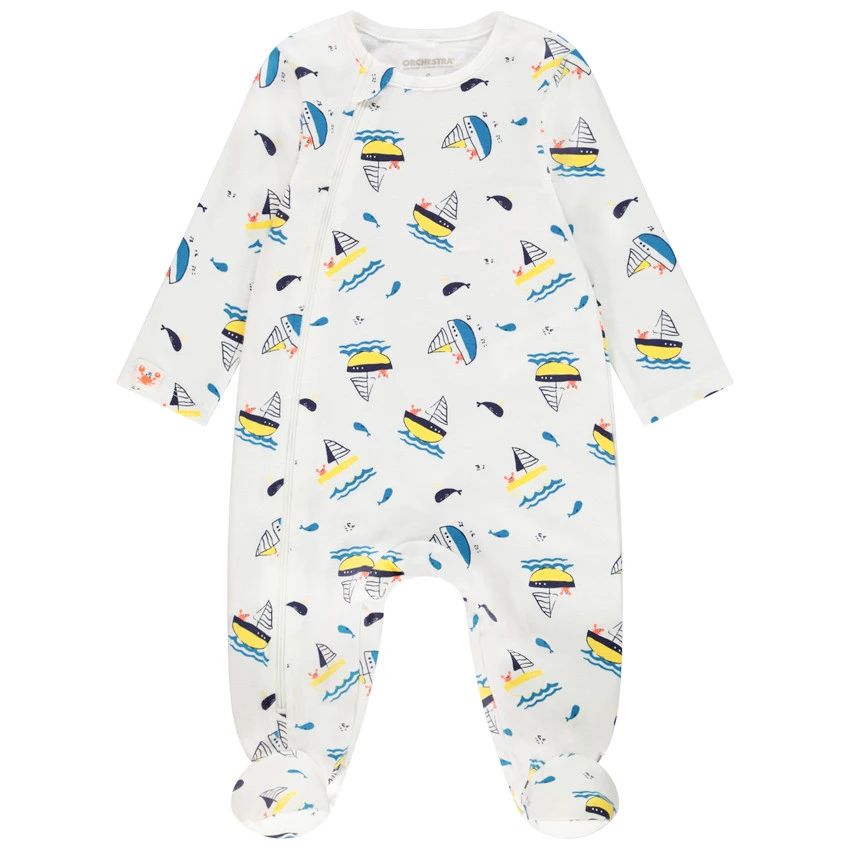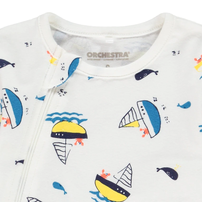Dors-bien en jersey. Imprimé bateau all-over. Ouverture zippée sur le devant pour faciliter l’habillement.