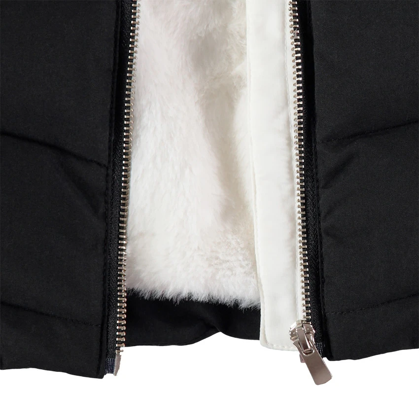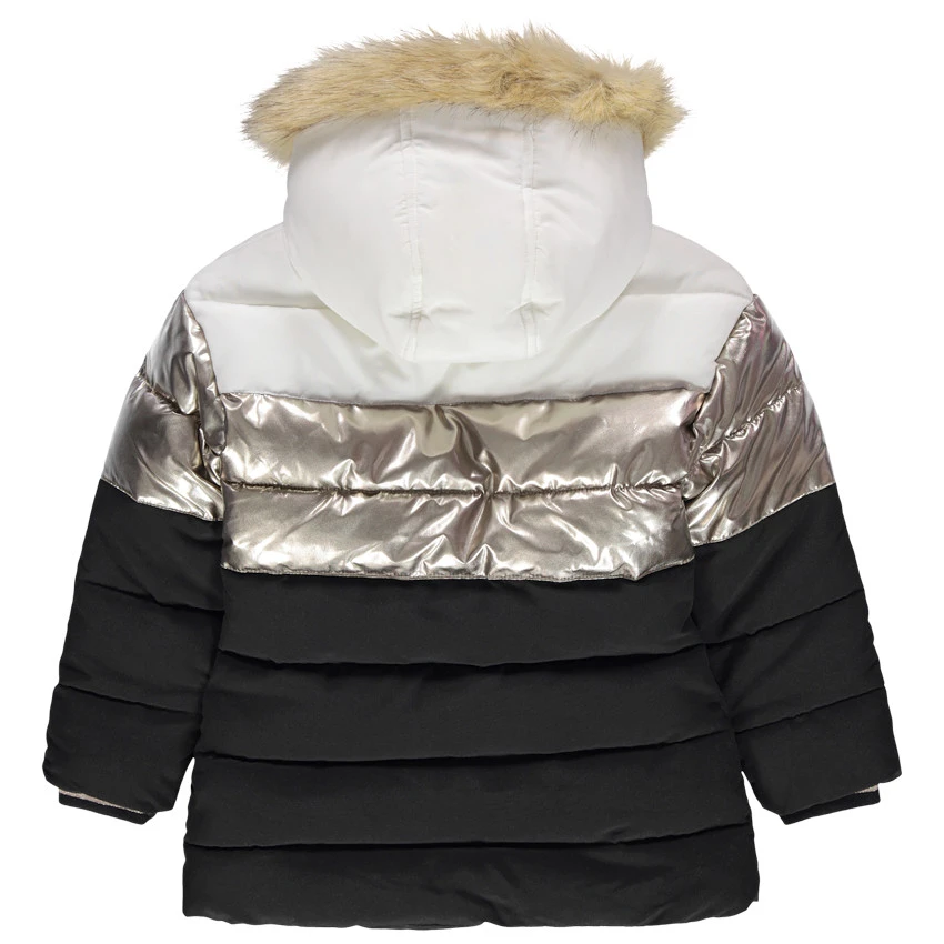 Doudoune matelassée tricolore. Bande du milieu métallisée. Doublure en sherpa. Capuche avec fausse fourrure. Ouverture zippée sur le devant. 2 poches zippées devant. Poignets élastiqués en bord-côte.