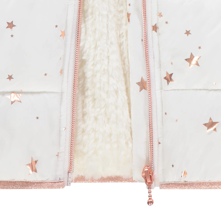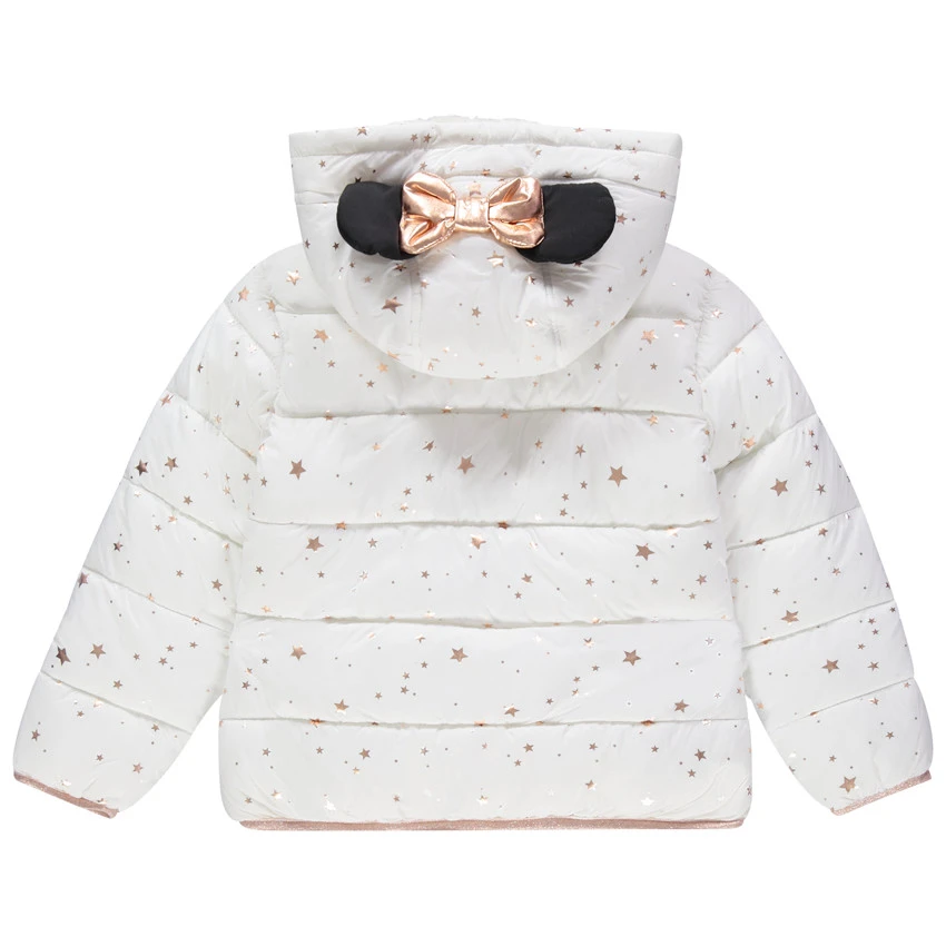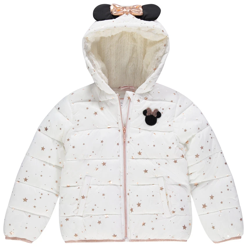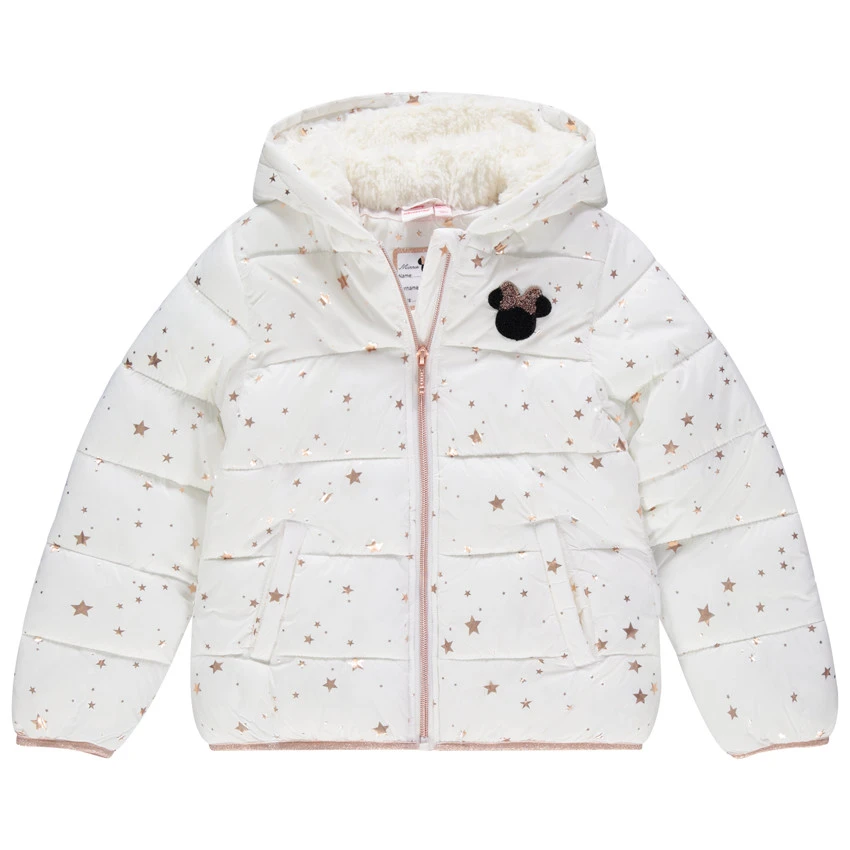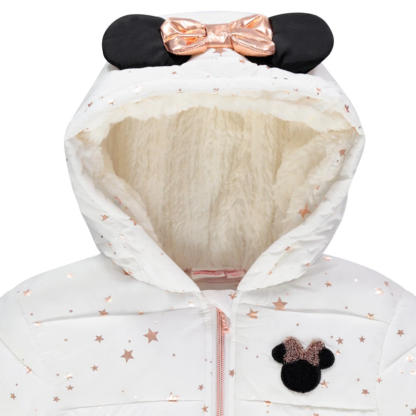 Doudoune imprimée étoiles all-over en foil. Oreilles de Minnie et noeud rose métallisé sur le dessus de la capuche. Doublure en sherpa. Badge Minnie sur la poitrine. Ouverture zippée devant. 2 poches coupées devant. Finitions biais brillant rose.