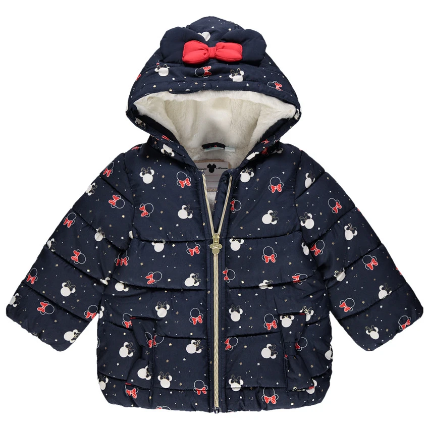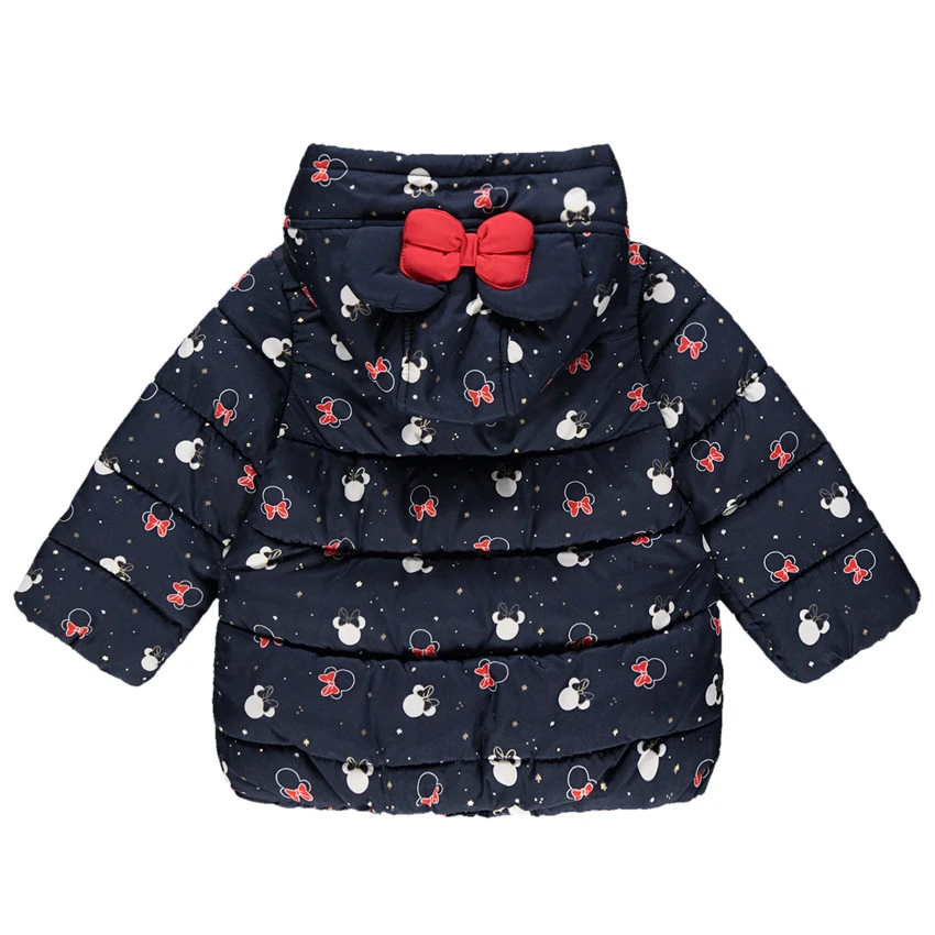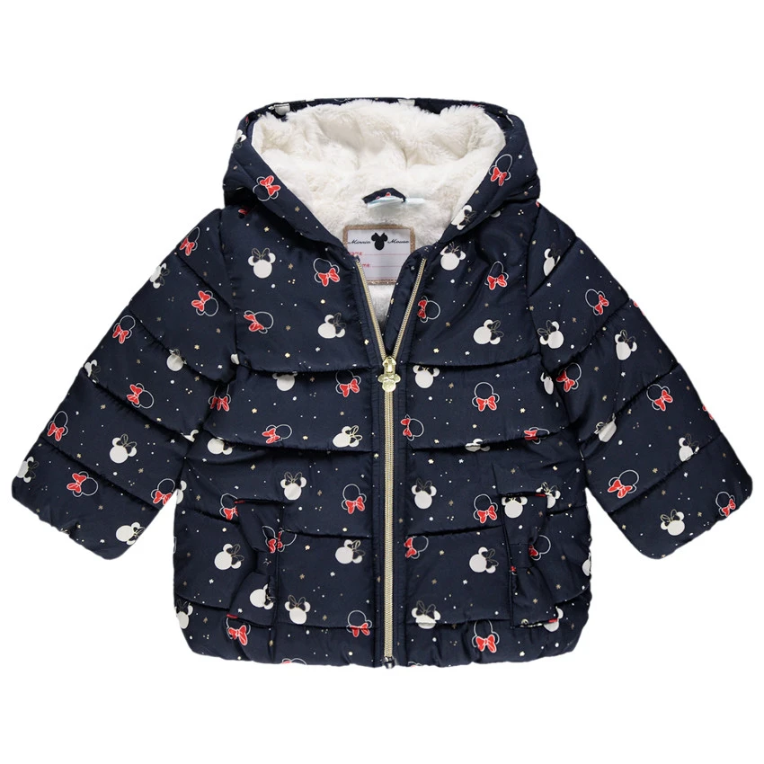 Doudoune à capuche. Imprimé Minnie all-over. Doublure en sherpa. Ouverture zippée devant. Bout du zip forme Minnie en métal. Oreilles en relief et noeud sur la capuche. 2 poches coupées devant.