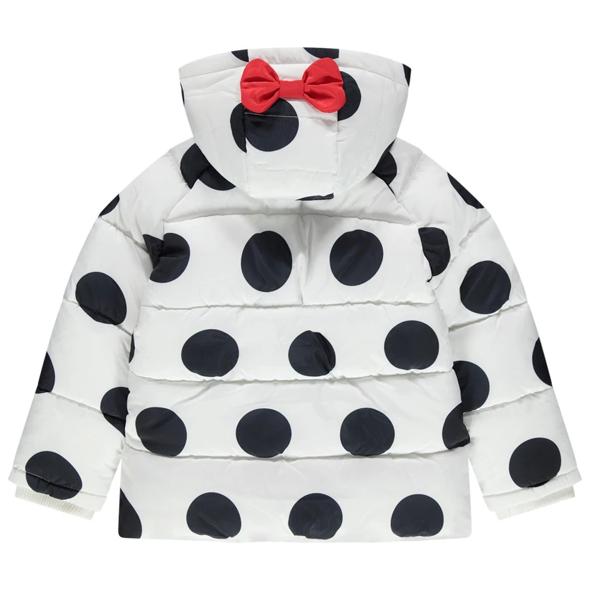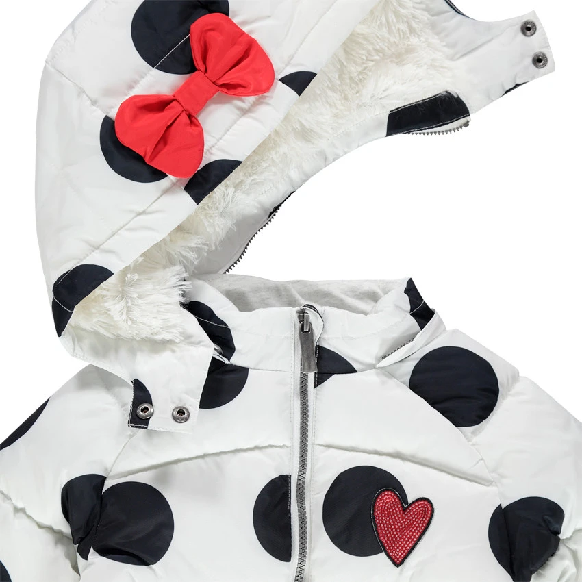 Doudoune matelassée imprimée pois all-over. Doublure en sherpa. Capuche zippée amovible. Noeud sur la capuche. Coeur en sequins sur la poitrine. Ouverture zippée sur le devant. 2 poches passepoilées devant. Intérieur des poignets élastiqué.