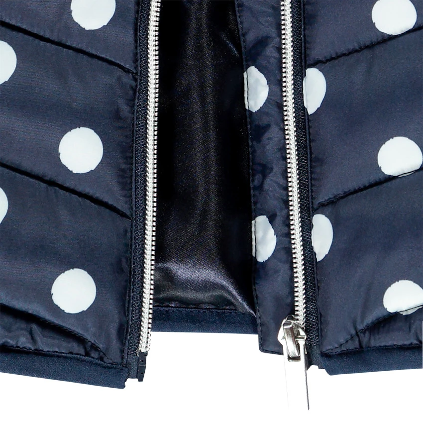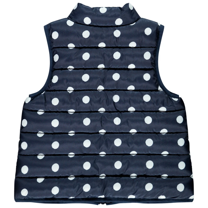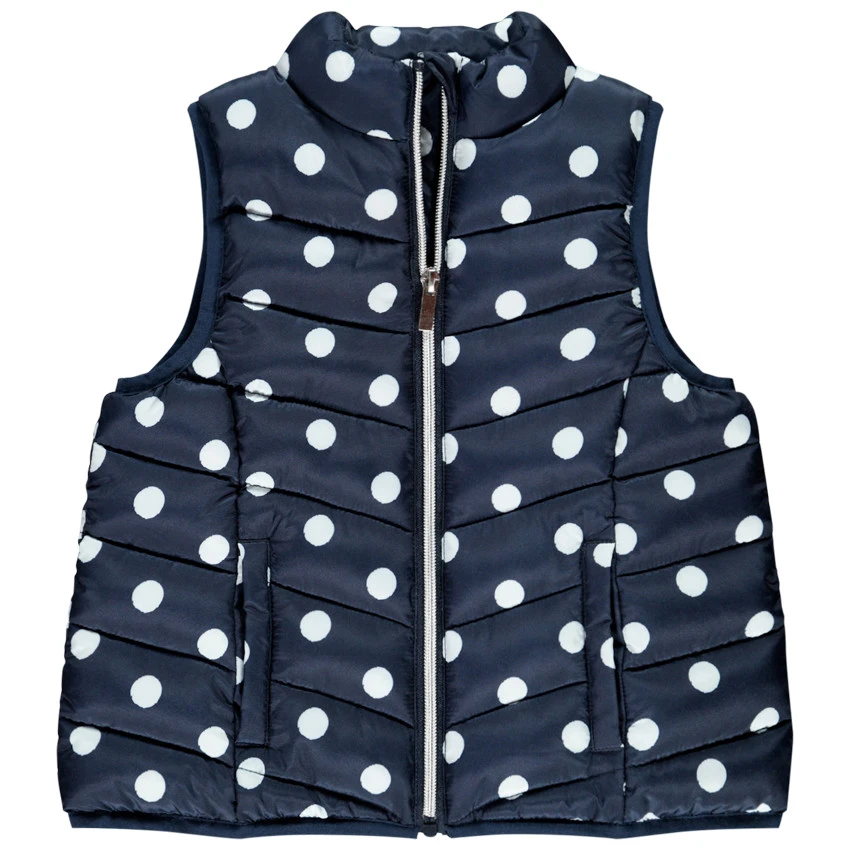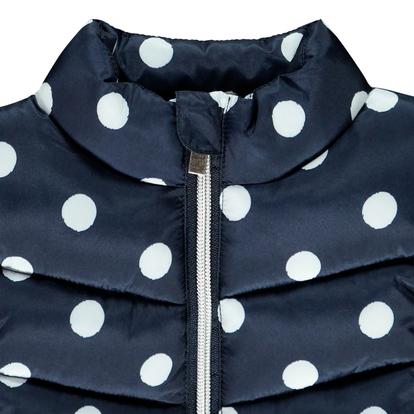 Doudoune sans manche. Col haut. Ouverture zippée sur le devant. Motif pois all-over. 2 poches passepoilées.