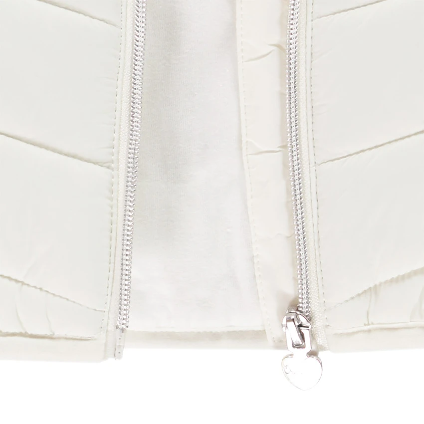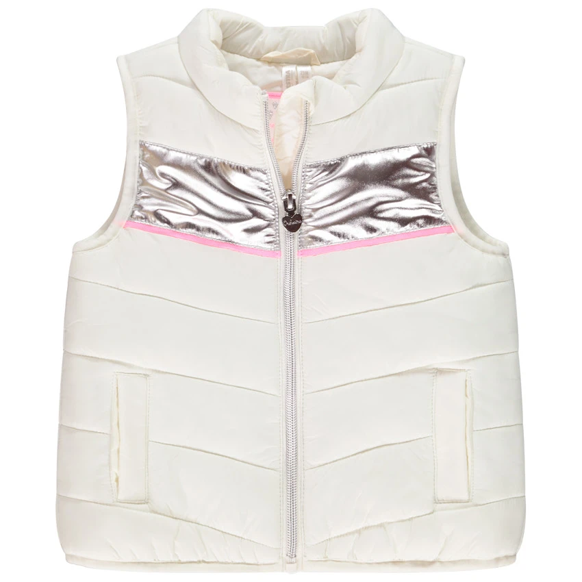 Doudoune sans manches matelassée. Encolure ronde. Ouverture zippée sur le devant. Fermeture éclair en forme de coeur. Effet métallisé sur le devant. Liseré rose sur le devant. Deux poches passepoilées sur le devant.