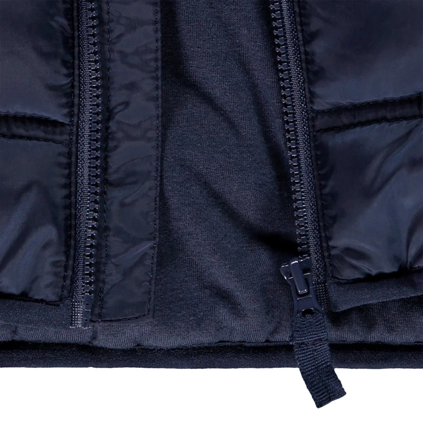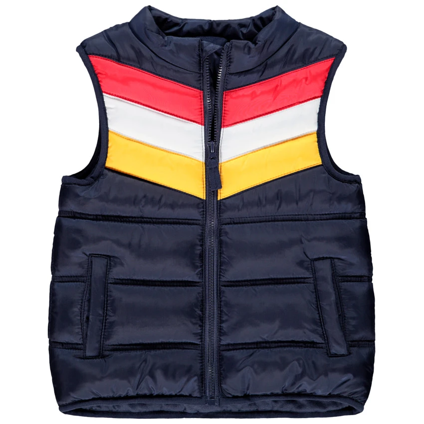 Doudoune sans manches matelassée. Encolure ronde. Ouverture zippée sur le devant. Bandes contrastées. Deux poches passepoilées sur le devant.