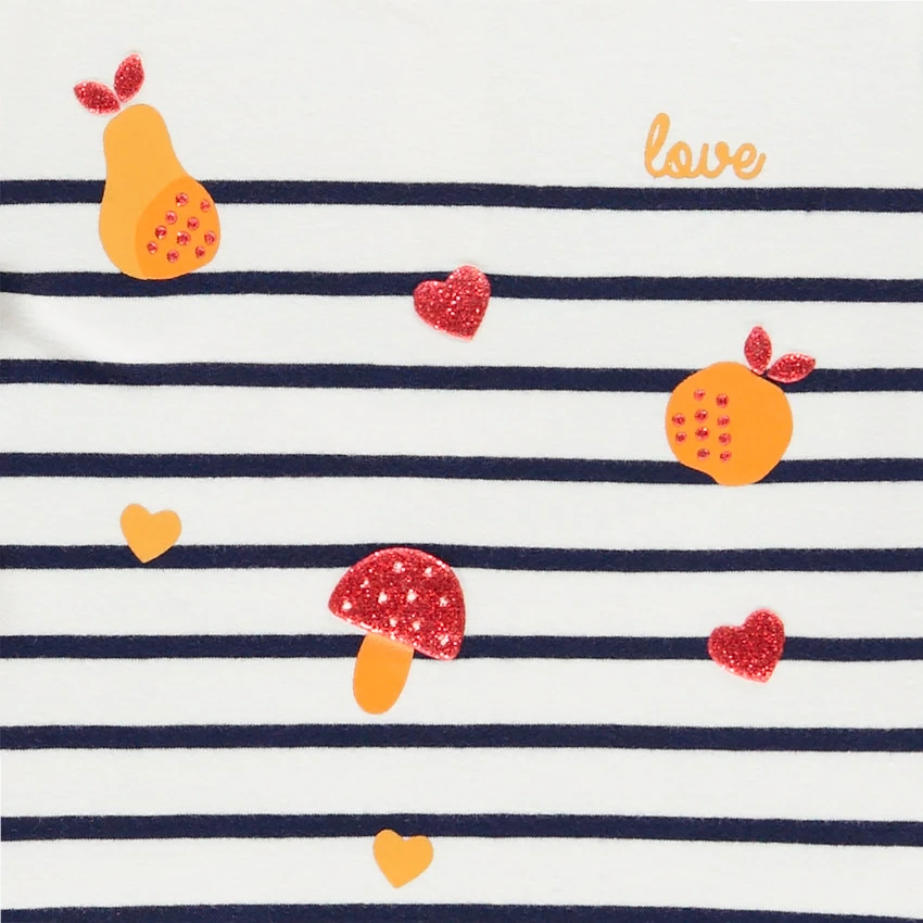 Sweat style marinière. Col rond. Rayures all-over. Motifs champignons et fruits sur le devant. Ouverture boutonnée au dos.