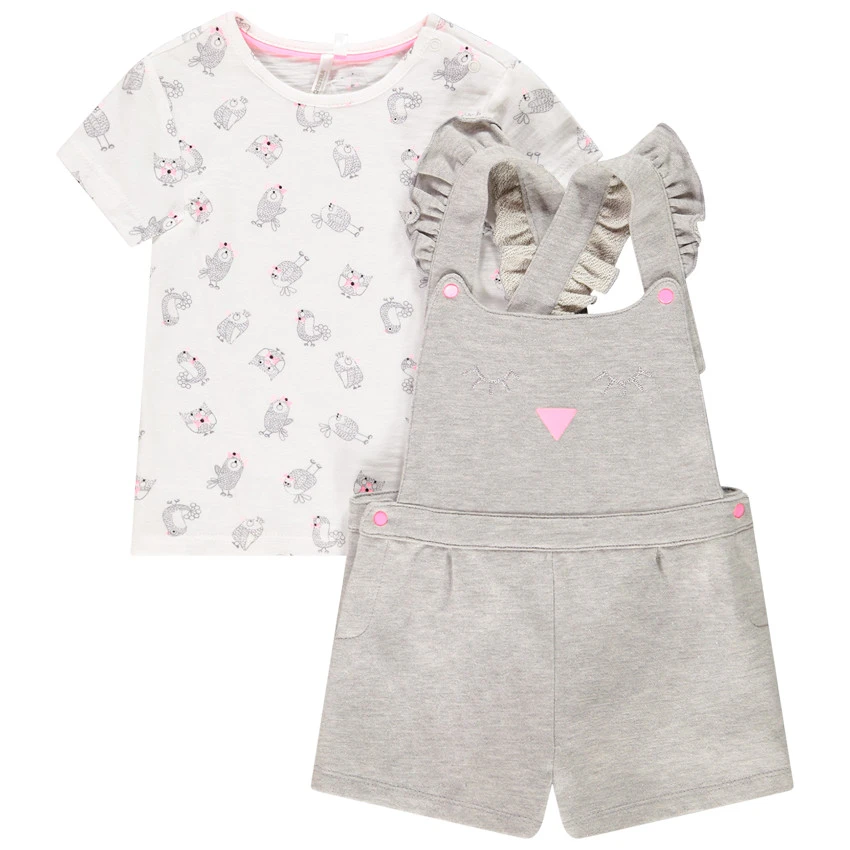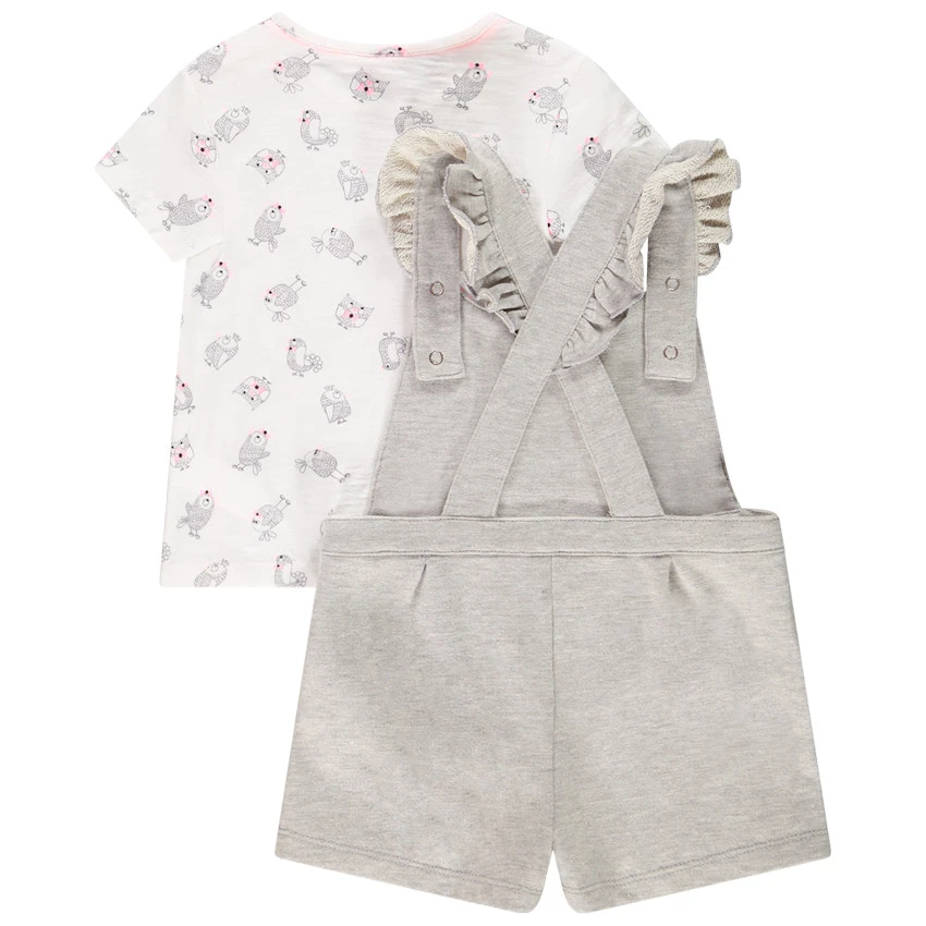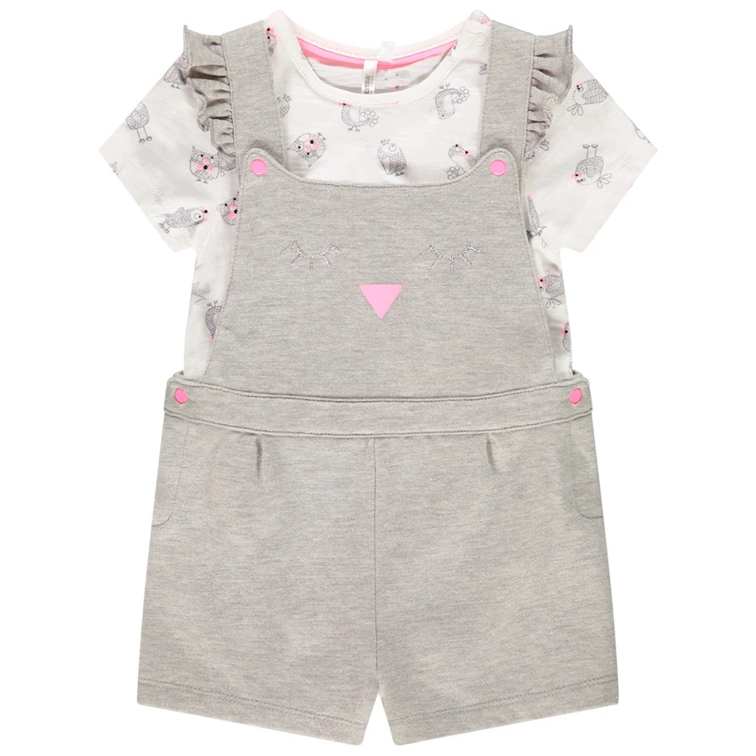 Salopette à bretelles volantées. Bouton aux bretelles. Motif sur le devant. Bouton sur le côté pour plus de confort.