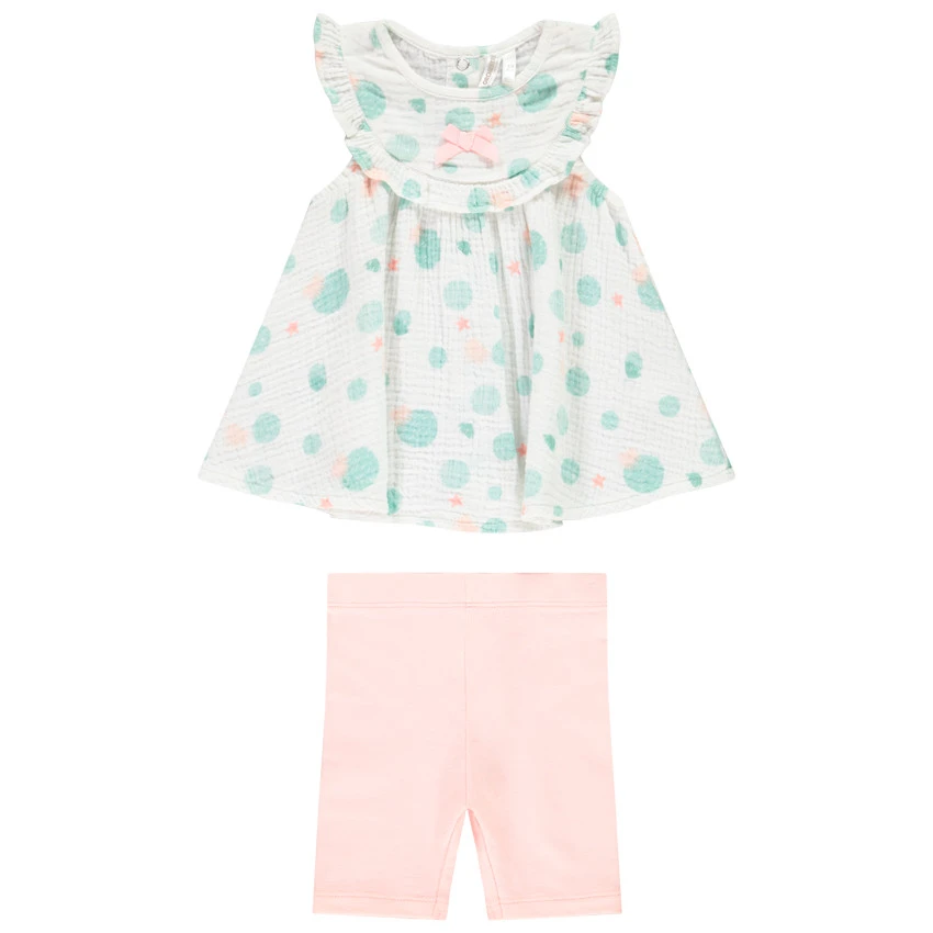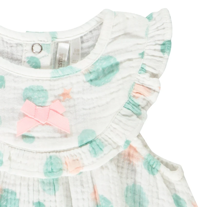Tuniques sans manches. Col rond. Epaule et poitrine volantés. Noeud cousu sur le devant. Bas ample. Motif pois all-over.