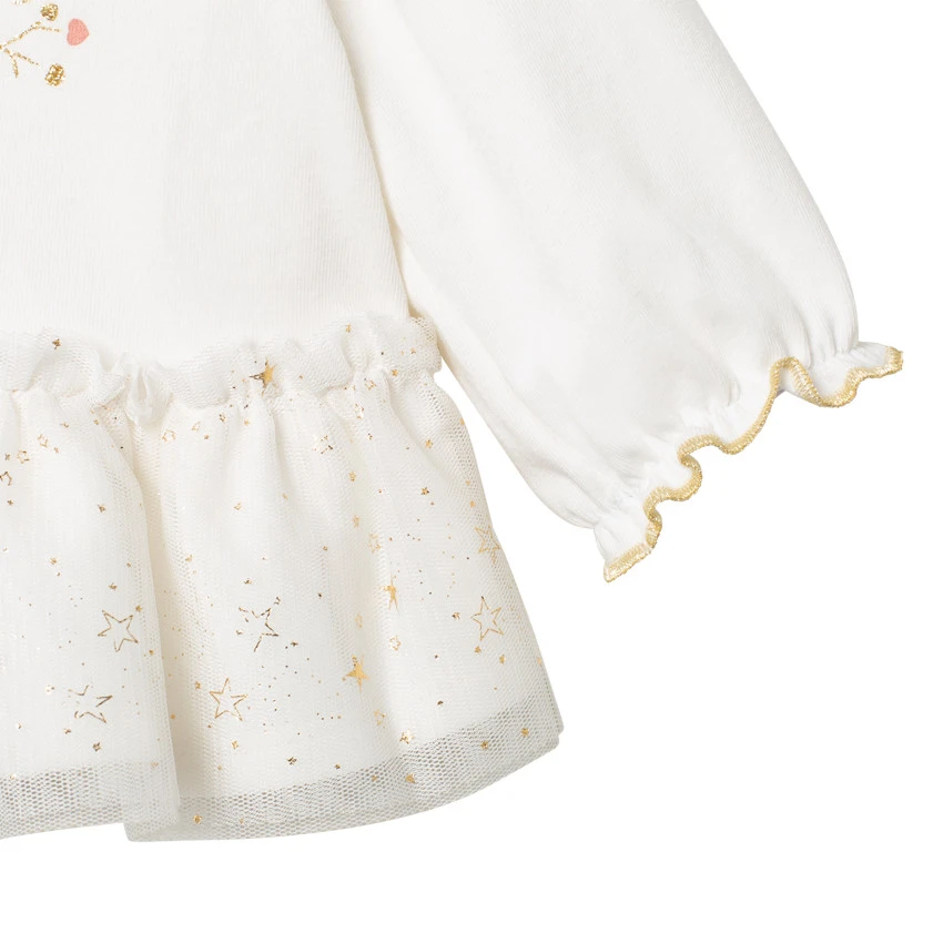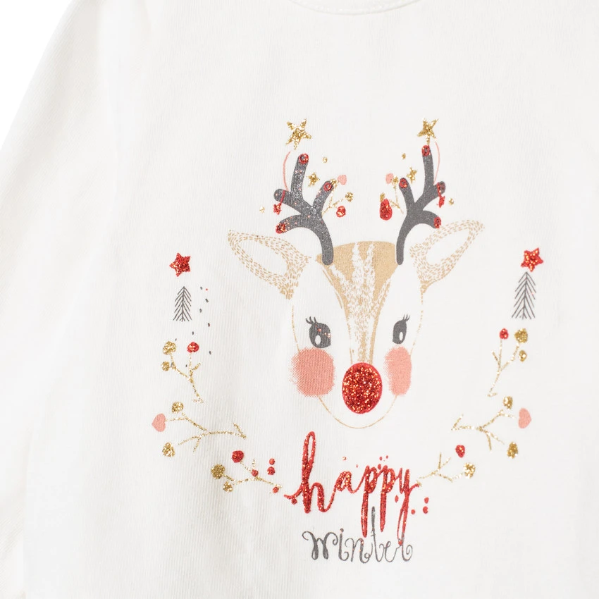 T-shirt manches longues. Print fantaisie esprit Noël. Bas volanté.