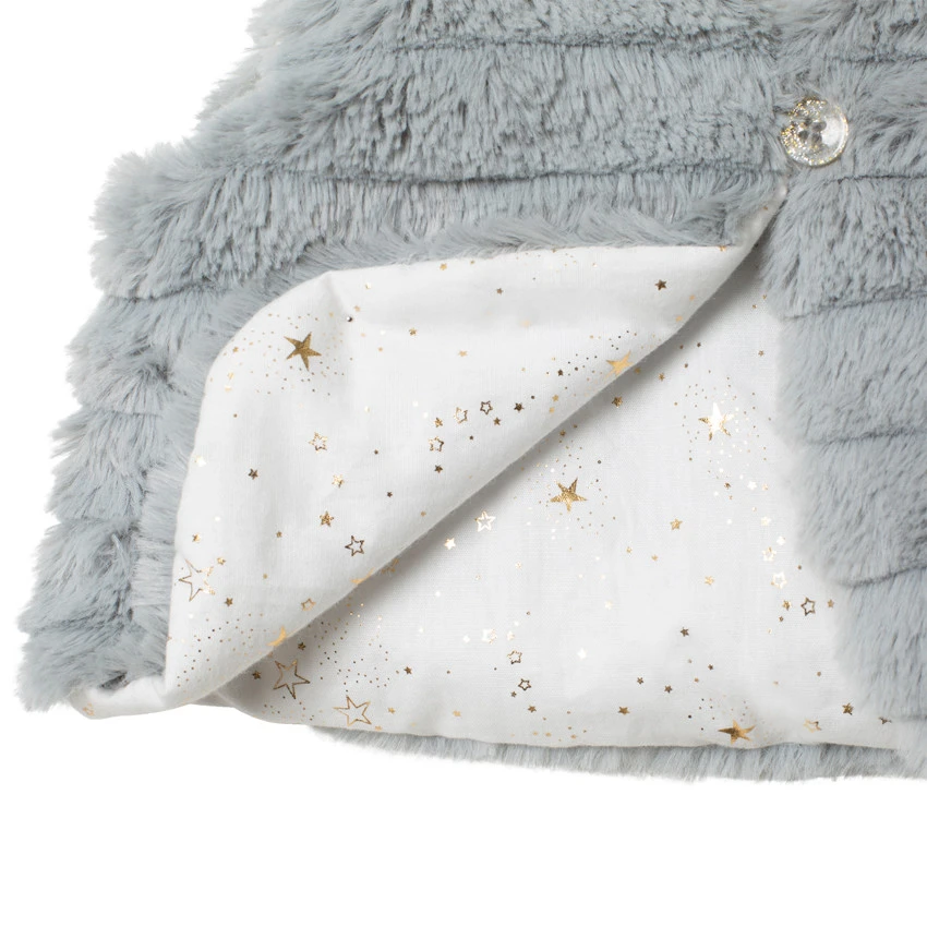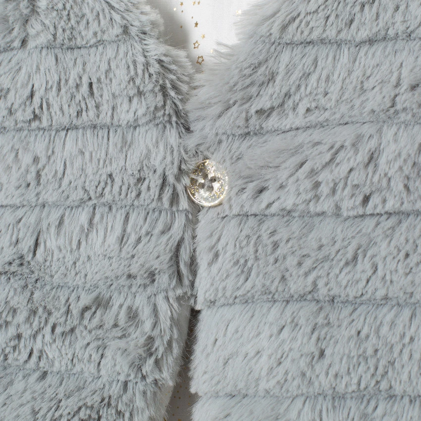 Gilet sans manche en fausse fourrure. Doublure imprimée. Bouton sur le devant.