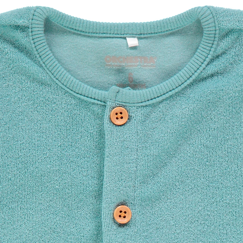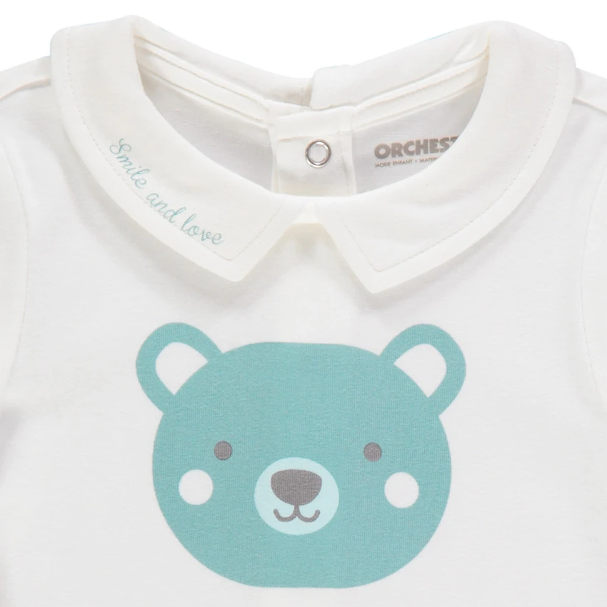 T-shirt manches longues uni. Col Claudine avec inscription printée. Ours printé devant. Ouverture pressionnée au dos.