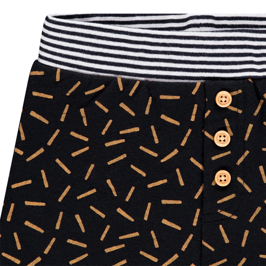 Pantalon imprimé. Taille élastiquée. Détails rayés. Boutons fantaisie.