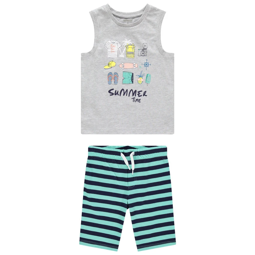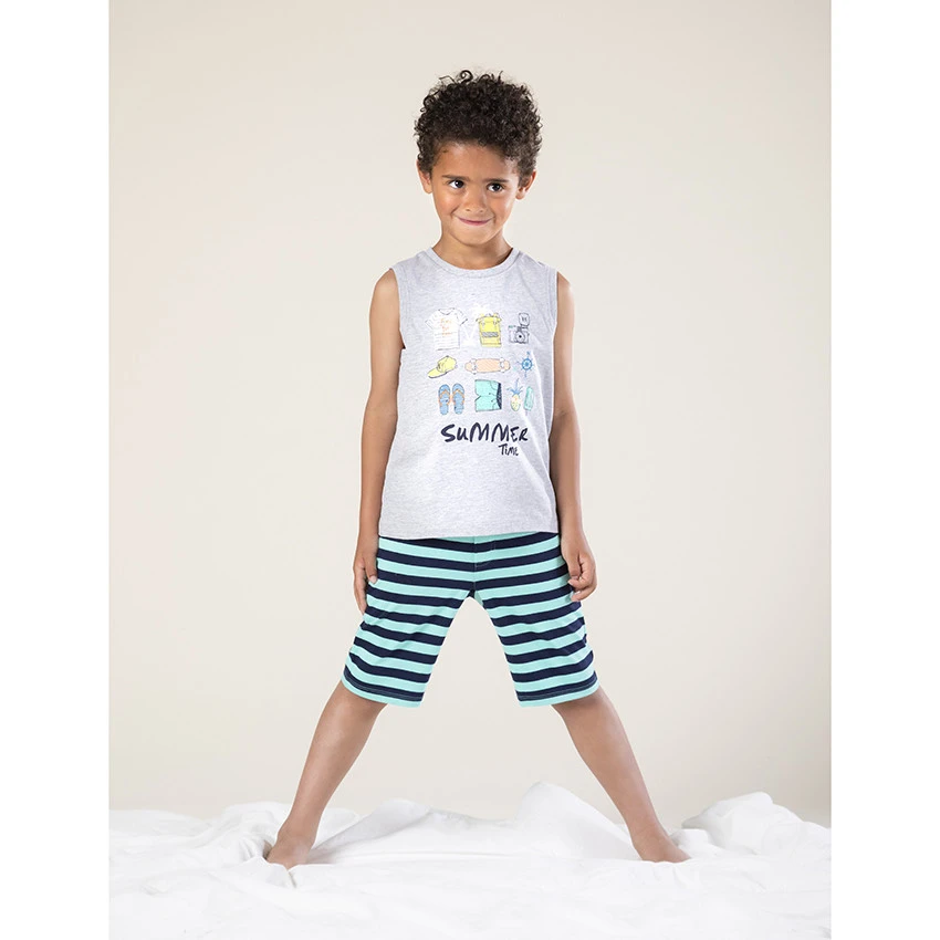 Débardeur gris chiné. Encolure ronde. Imprimé esprit vacances sur le devant.
