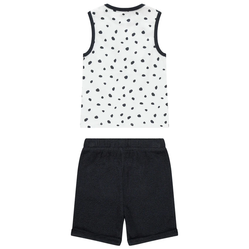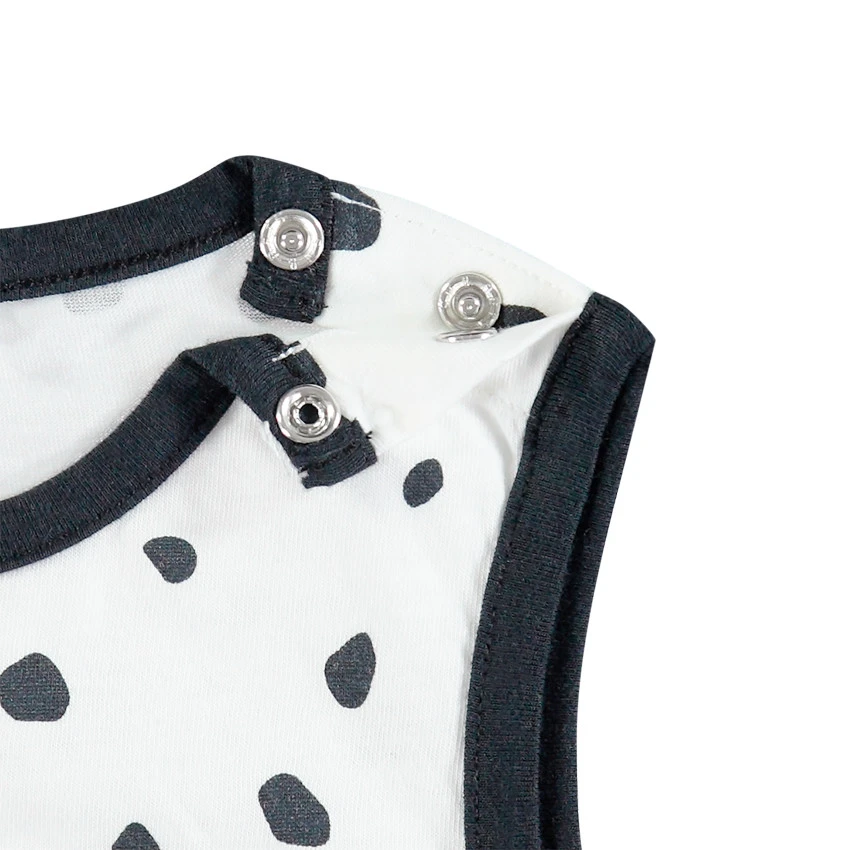 Débardeur à taches all-over. Encolure ronde à ouverture pressionnée pour faciliter le passage de la tête. Message printé devant.