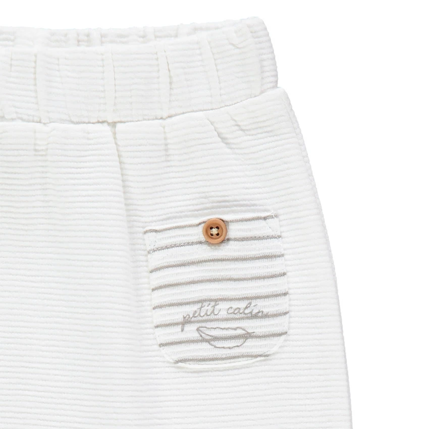 Pantalon uni en maille fantaisie. Taille élastiquée. 1 poche fantaisie rayée. Revers fixes.